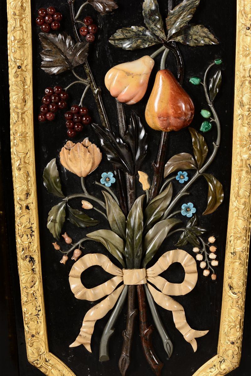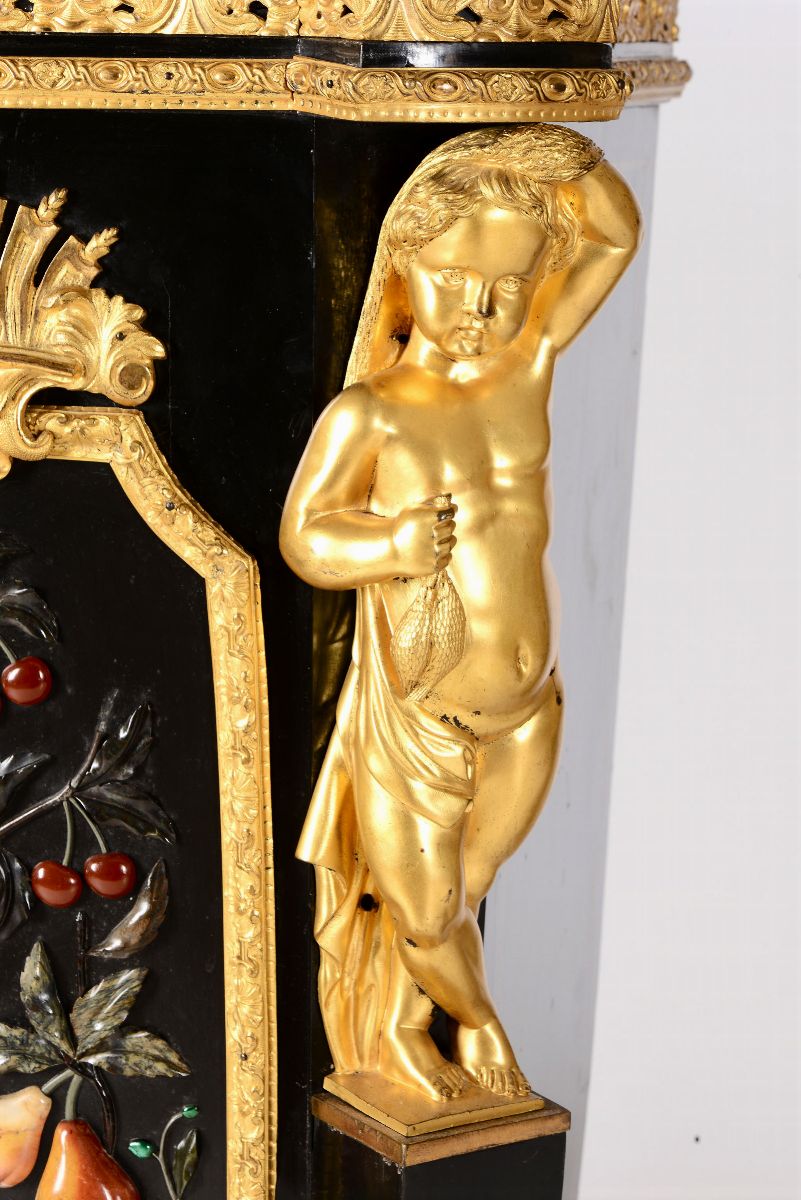 legno ebanizzato, ricche decorazioni in bronzi dorati, figure di putti a tuttotondo sui lati, al centro cartiglio racchiude raffinata composizione di fiori e frutti in inserti di pietre semi preziose