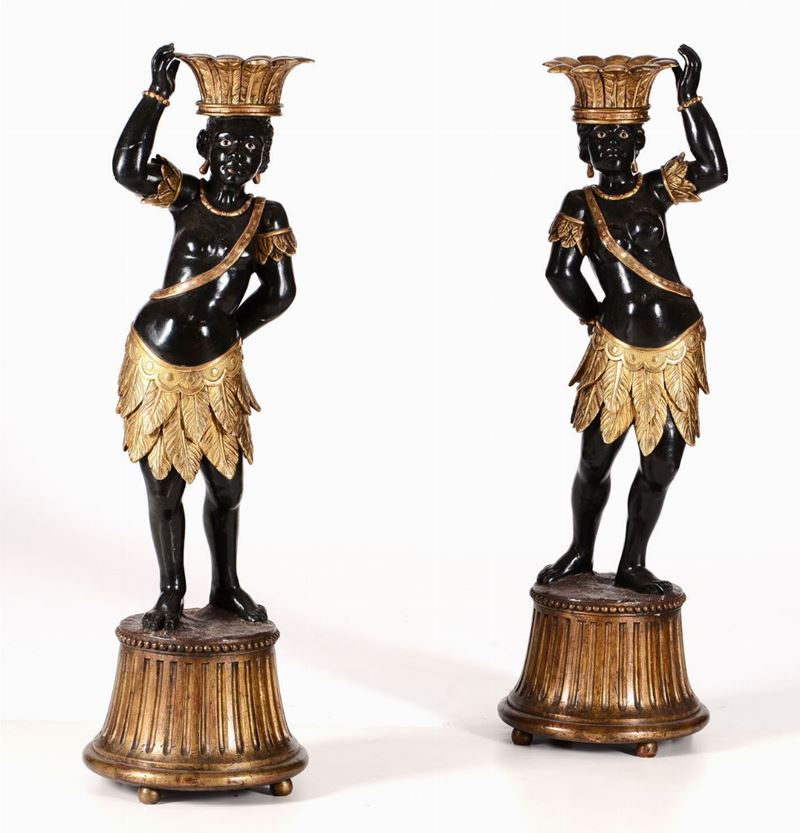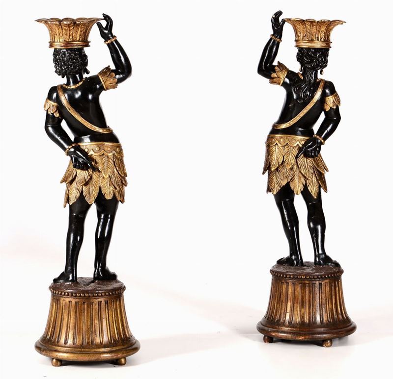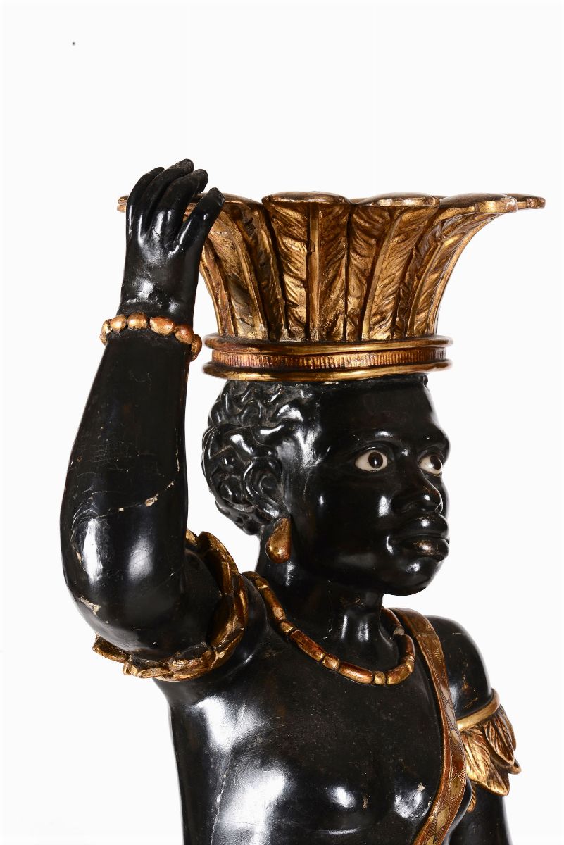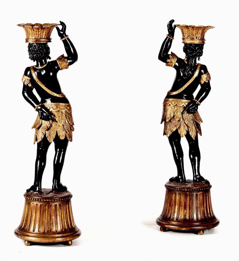 Coppia di porta vasi a foggia di moro in legno scolpito, dorato ed ebanizzato, arte italiana del XIX-XX secolo