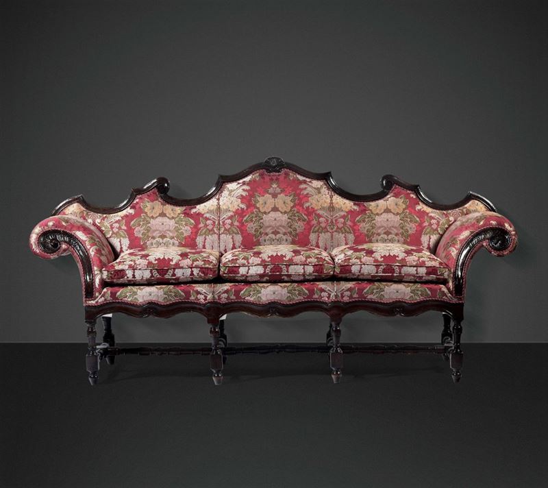 Due divani a orecchioni in noce riccamente intagliati e tessuto rosso con decori floreali, Lombardia XVIII secolo