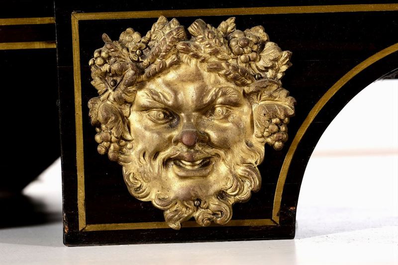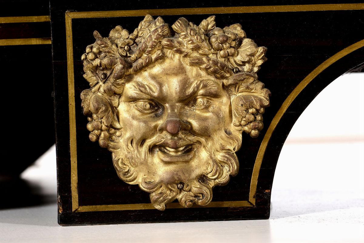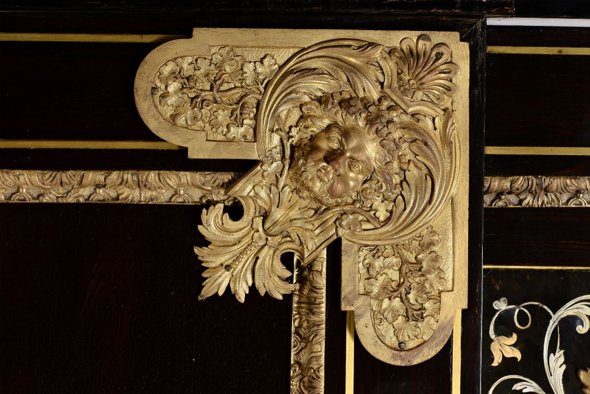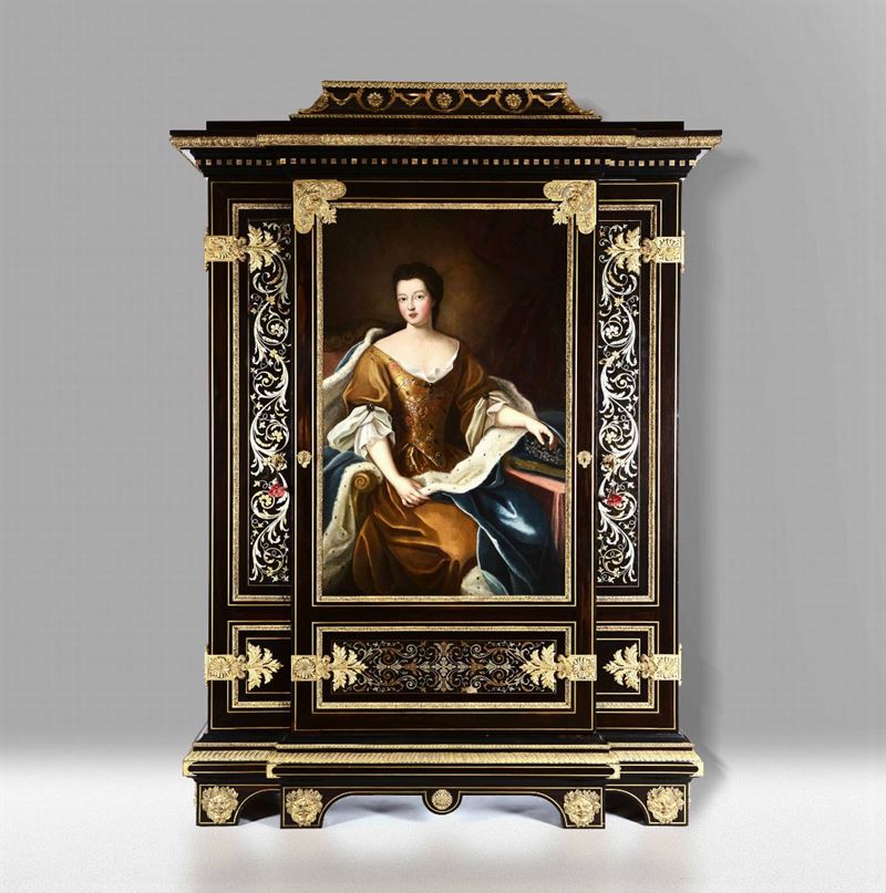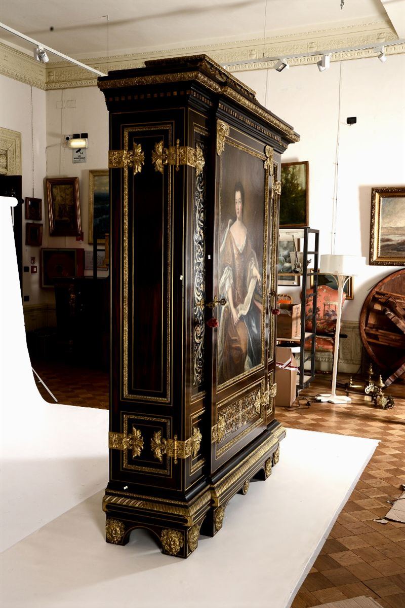 Importante armadio Napoleone III con anta centrale dipinta, inserti argentati e dorati a marqueterie e ricche montature in bronzo dorato, alla maniera di André Charles Boulle, Francia XIX secolo