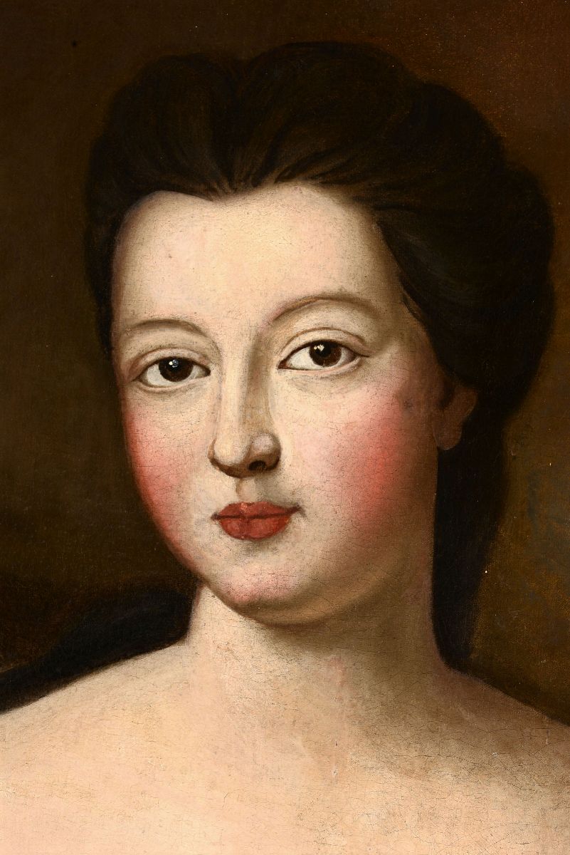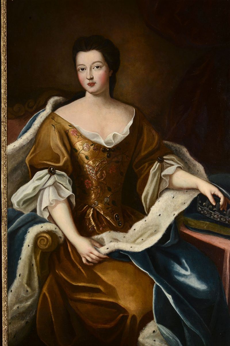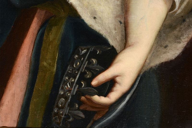 sui lati due piccoli sportelli intarsiati e al centro grande anta con ritratto di nobildonna. Ricchissime cerniere in bronzo dorato, base ritmata da teste di leone, cm 186x55x270