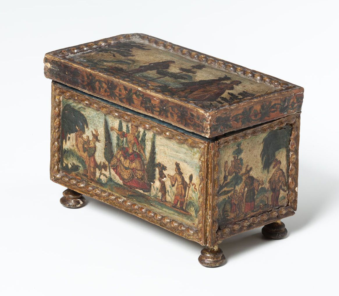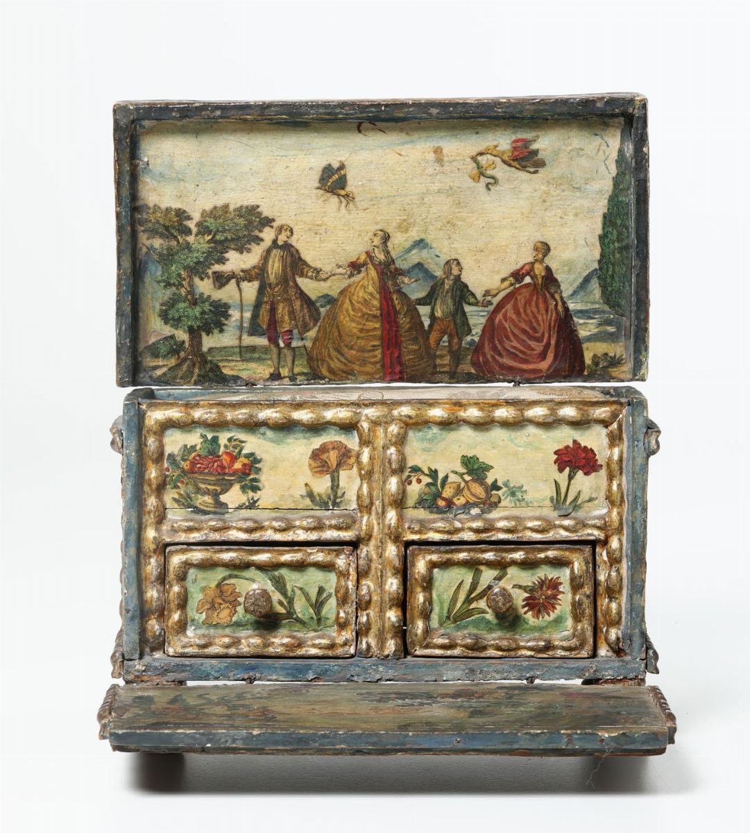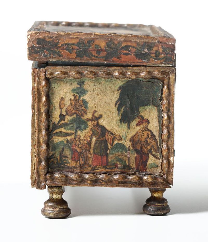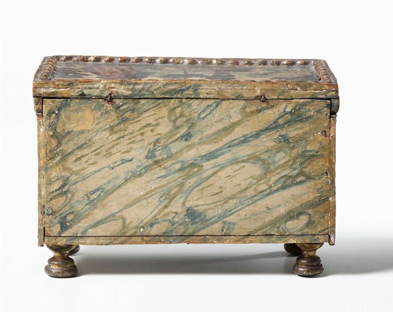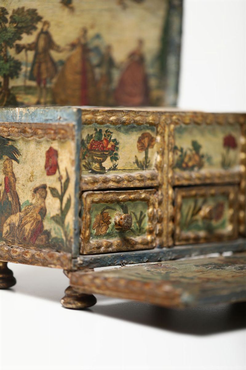 Portagioie a scrigno in legno dipinto in policromia a scene galanti, XVIII-XIX secolo