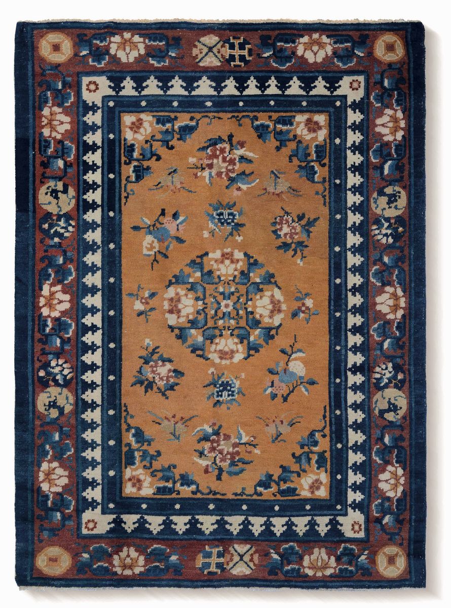 fondo ocra con medaglione centrale floreale circondato da peonie, melograni e fiori di pesco. Bordura principale marrone con peonie, bordura interna con madacyl blu e bianco cm 250x170
