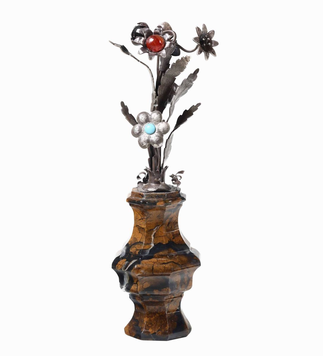 Vasetto in diaspro di Sicilia e bouquet di fiori in argento sbalzato, cesellato, pietre dure, corallo e turchese. Sicilia o Napoli XVIII secolo