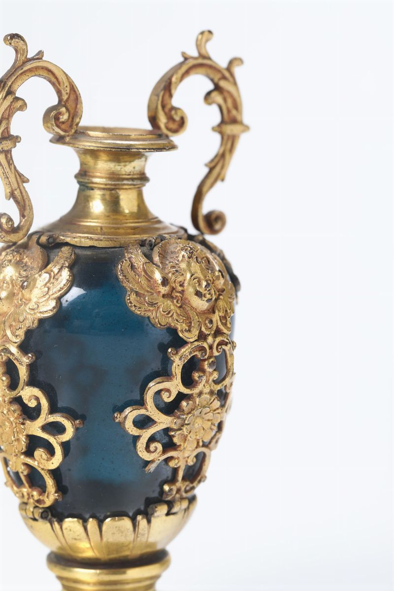 Vaso in vetro soffiato colore blu con montatura in bronzo cesellato e dorato. Firenze o Pisa fine XVII inizi XVIII secolo