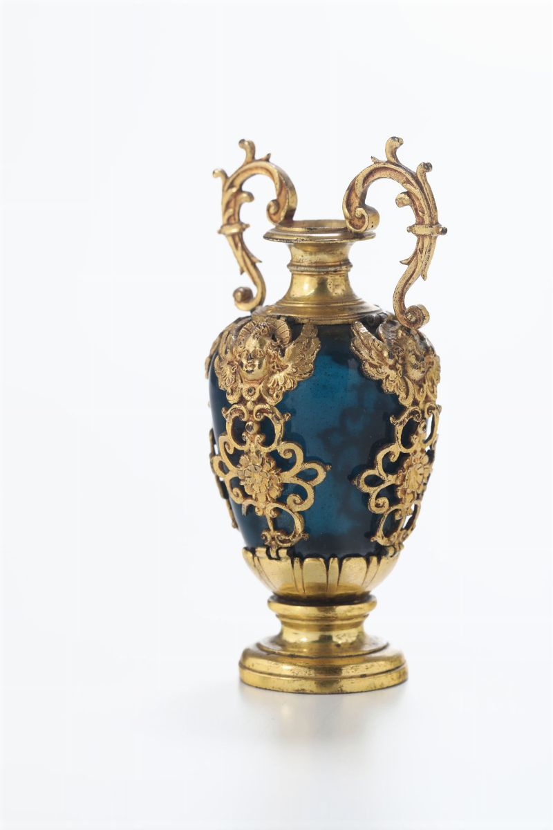 Vaso in vetro soffiato colore blu con montatura in bronzo cesellato e dorato. Firenze o Pisa fine XVII inizi XVIII secolo [..]