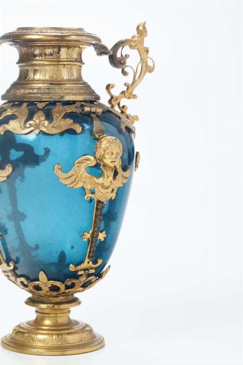 Vaso in vetro soffiato colore verde acquamarina con montatura in bronzo e rame cesellato e dorato. Probabilmente Firenze prima metà del XVII secolo