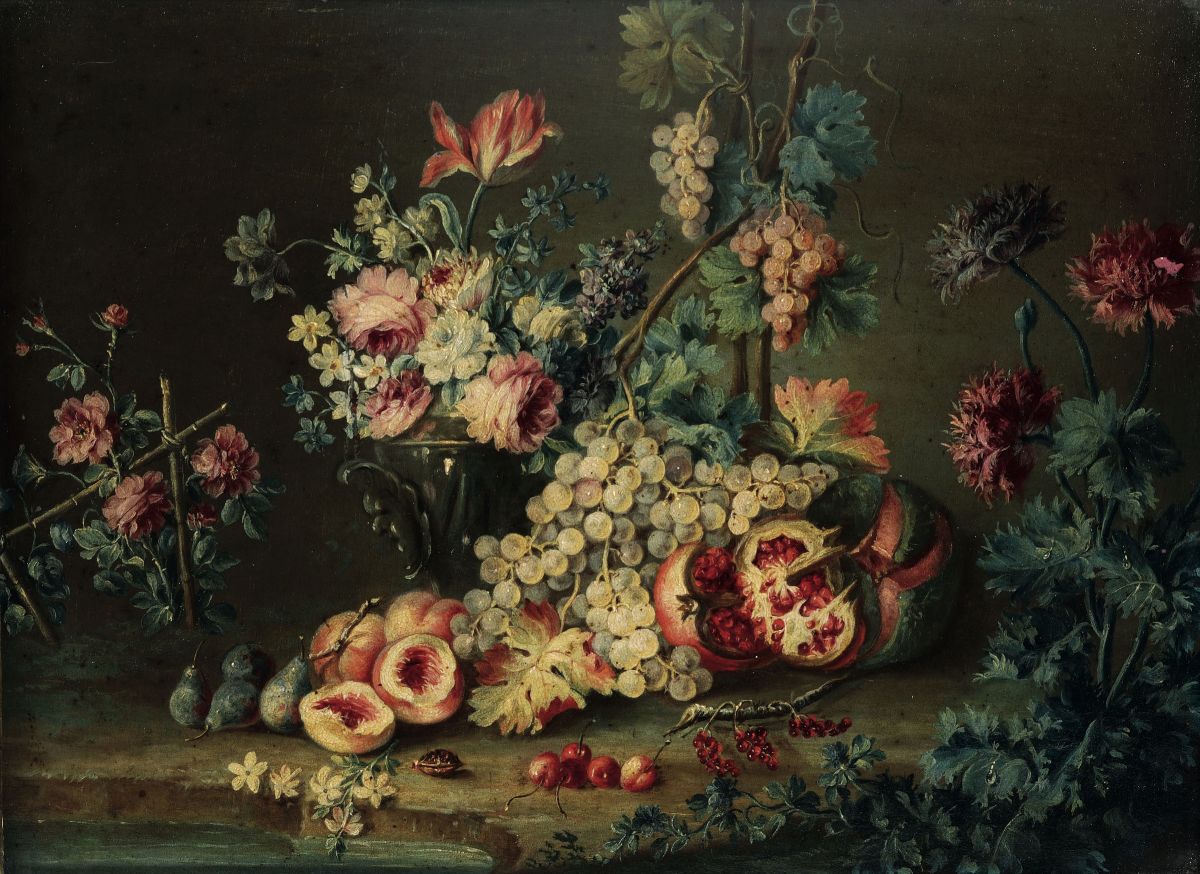 Michele Antonio Rapous (Torino 1733-1819) Nature morte con cesti colmi di frutti e vasi di fiori