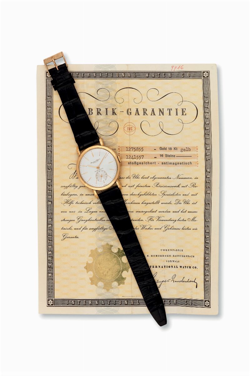 IWC, International Watch Co., Schaffhausen, Mobec-Zurich, Ref. 468, case No. 1275855, movement no. 1241557. Fine, 18K yellow gold wristwatch with original buckle. Accompanied by the IWC Exctract, Guarantee and box. Sold in 1953