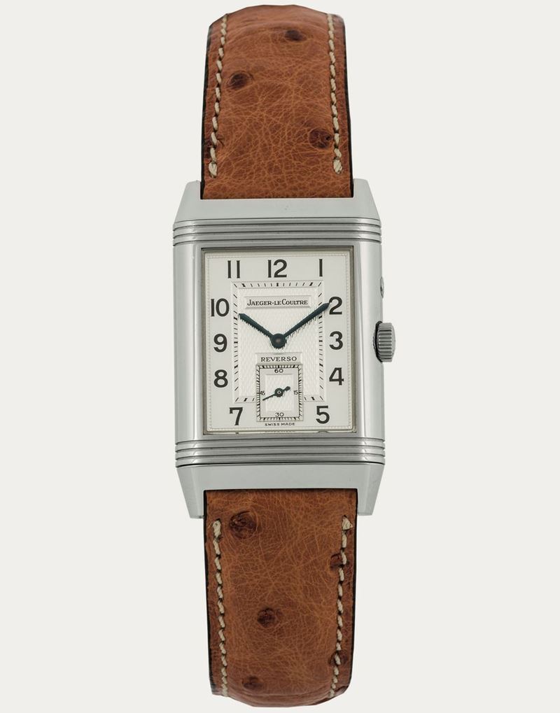 Jaeger-LeCoultre, Reverso, Duoface Night and Day, Ref. 270.8.54. Very fine, rectangular and reversible, two time zone, double dialed, stainless steel wristwatch with a stainless steel Jaeger-LeCoultre deployant clasp. Accompanied by the original box, booklet, setting pin and Guarantee. Sold in 1998