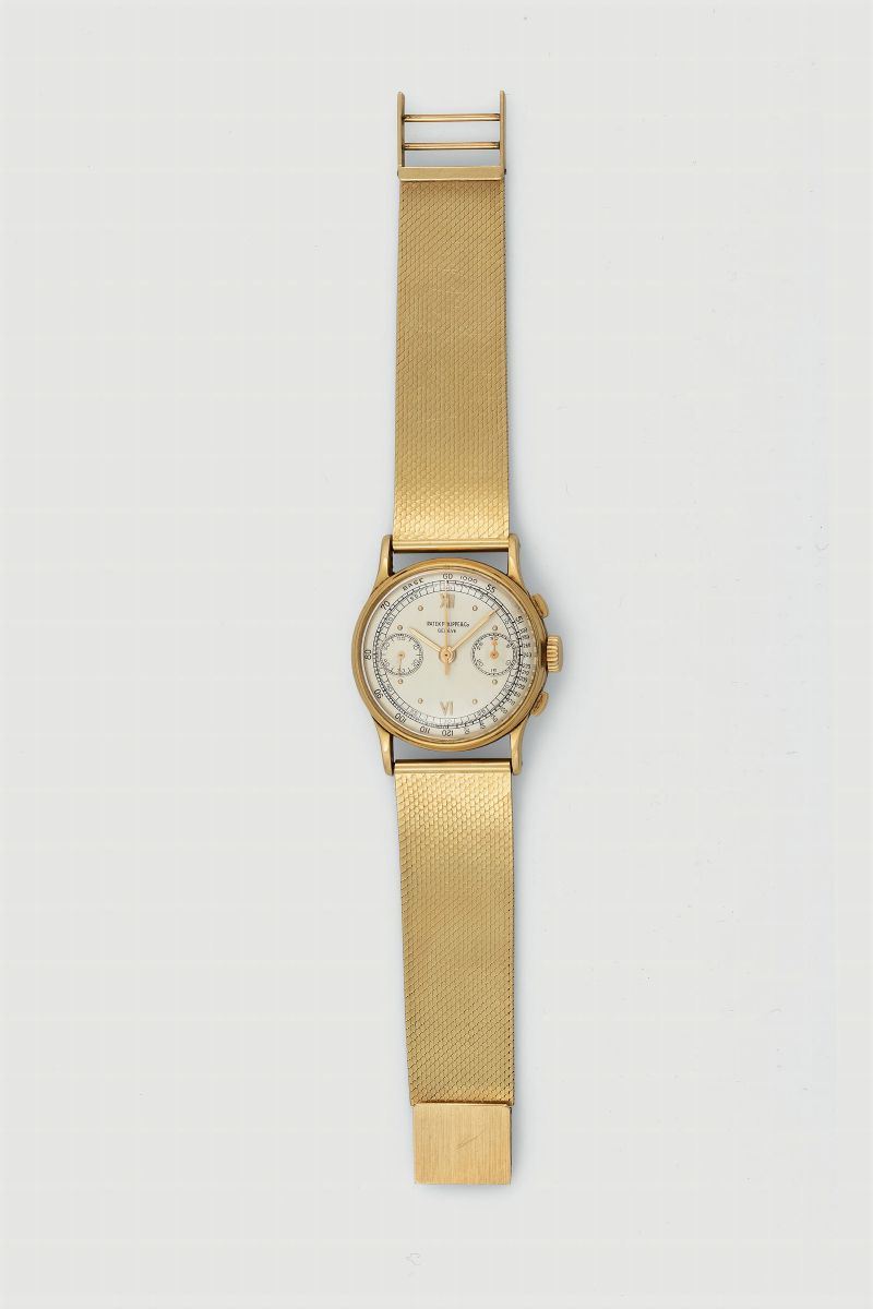 Patek Philippe & Co., Genève, case No. 650066. Ref. 130. Very fine and rare, 18K yellow gold wristwatch with square button chronograph, register, tachometer and an 18K yellow gold bracelet. Accompanied by the Extract from the Archives. Made ithe 1940's