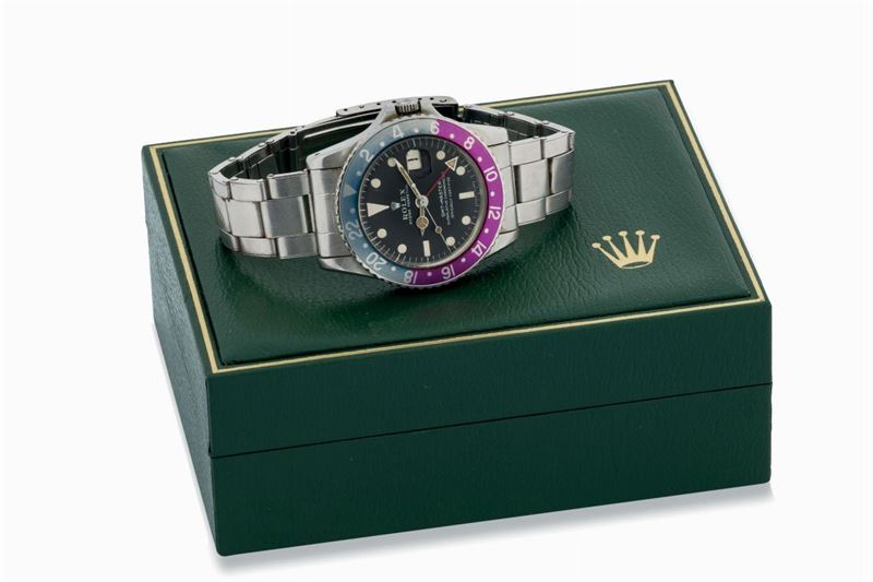ROLEX, "Oster Perpetual, GMT-MASTER, Superlative Chronometer officially Certified", case No. Ref. 1675. cassa No. 1739610. Orologio da polso, automatico, impermeabile, in acciaio, con datario, doppio fuso orario e bracciale originale rivettato Rolex Re. 7206 con chiusura deployante. Accompagnato dalla scatola originale e libretto. Realizzato nel 1968