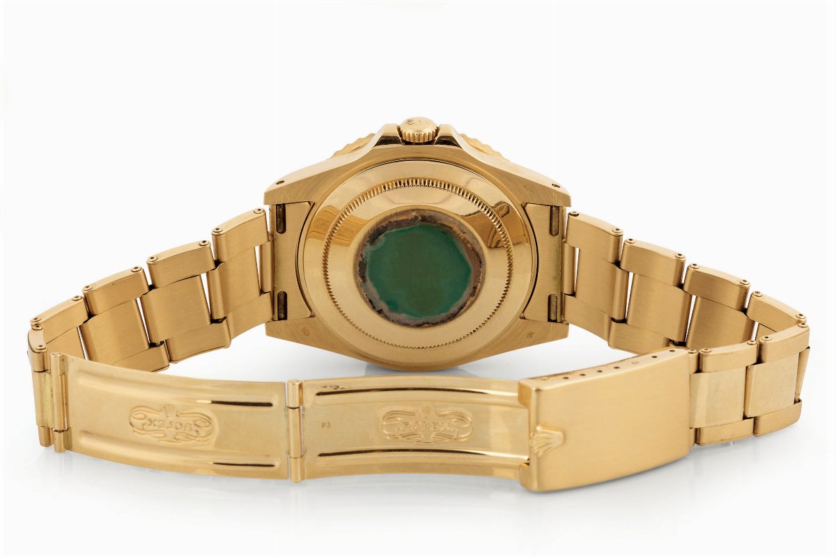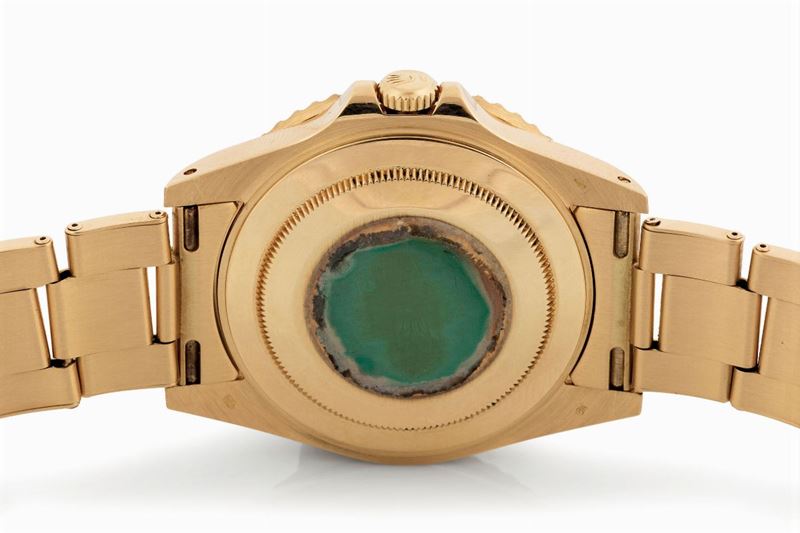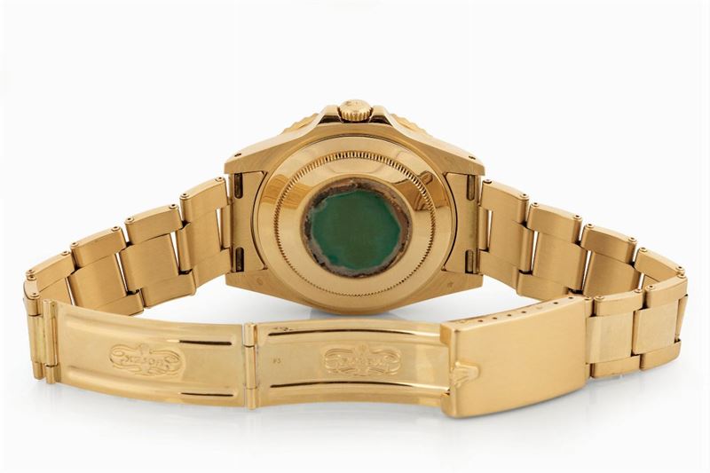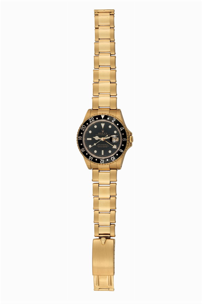 Rolex, Oyster Perpetual Date, GMT-Master II, Superlative Chronometer, Officially Certified, Ref. 16718. Case No. E788943 Fine, center seconds, self-winding, water-resistant, two time zone, 18K yellow gold wristwatch with special black 24-hour gold bezel and hand, independently adjustable hour hand and quick date set, and 18K yellow gold riveted Rolex Oyster bracelet.Made circa 1990