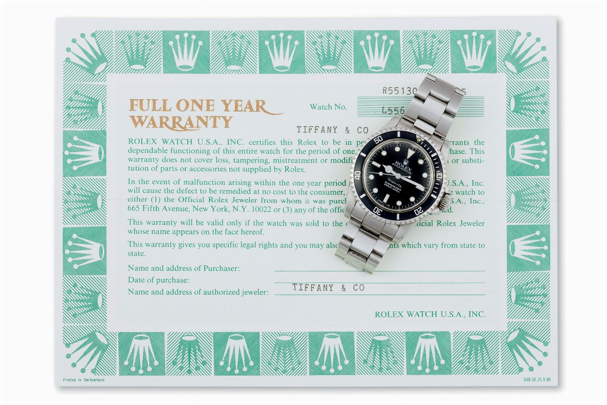 Rolex, Submariner, Oyster Perpetual, 660 ft/ 200 m., case No. L556086, Ref. 5513. Fine, center seconds, self-winding, water-resistant, stainless steel wristwatch with a stainless steel Rolex Fliplock Oyster bracelet. Made circa 1989, sold in 1990. Accompanied by a Rolex box, original Guarantee signed Tiffany, paper, additional links, hang tag, Rolex handkerchief, original Customer copy and Rolex Oyster booklet.