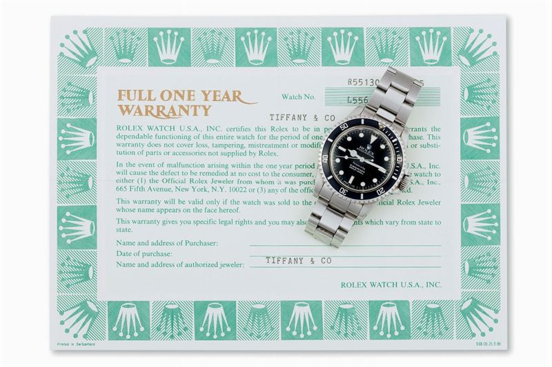 NOTE: A rare example of the reference 5513; the present timepiece is offered by an Important Private collector with original Rolex hang tag and warranty stamped Tiffany & Co. The wristwatch is bestowed with an attractive black dial with applied “bicchierini” indexes, differing from earlier examples were indexes were printed on the dial.
