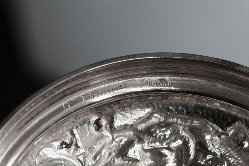 Molten, embossed and chiselled silver. 1050gr, diam 24.5cm, H 19.5cm