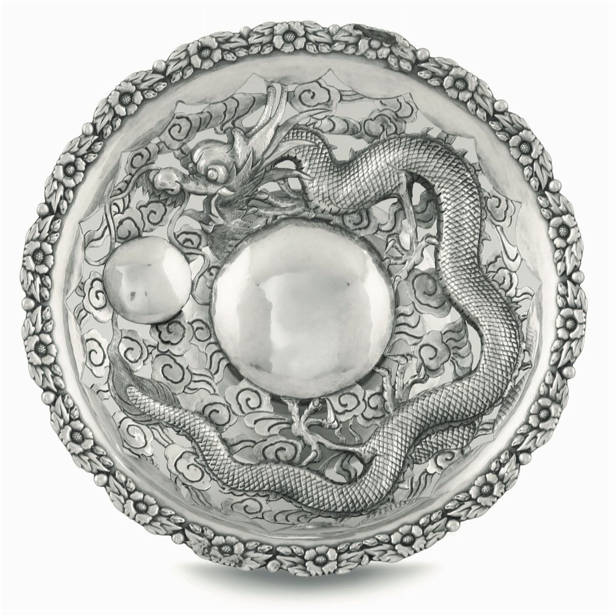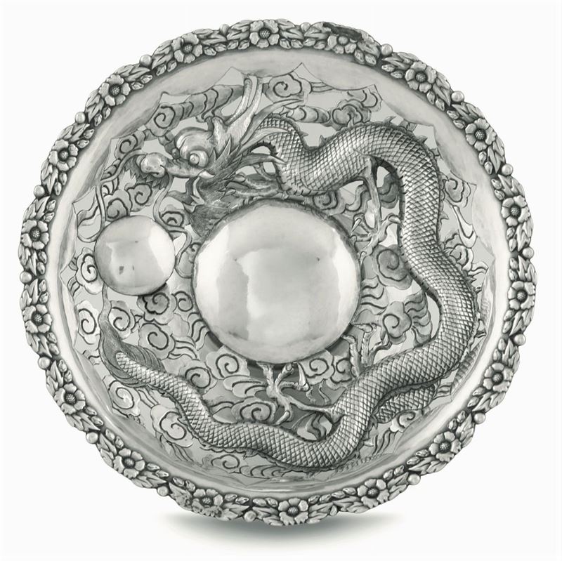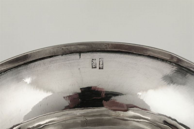 Molten, embossed and chiselled silver. 370gr, diam 21.5cm, H 6.5cm