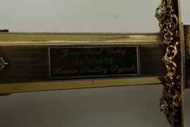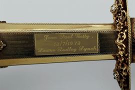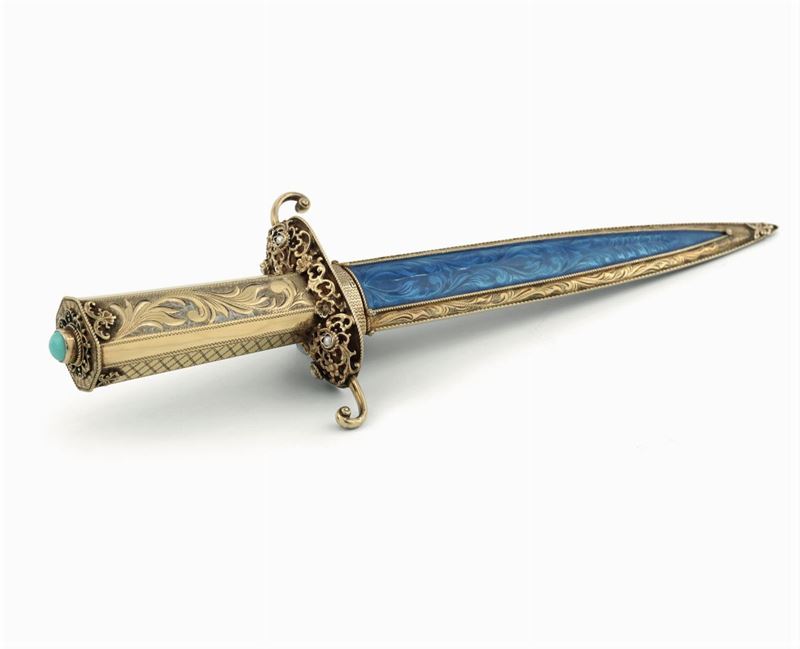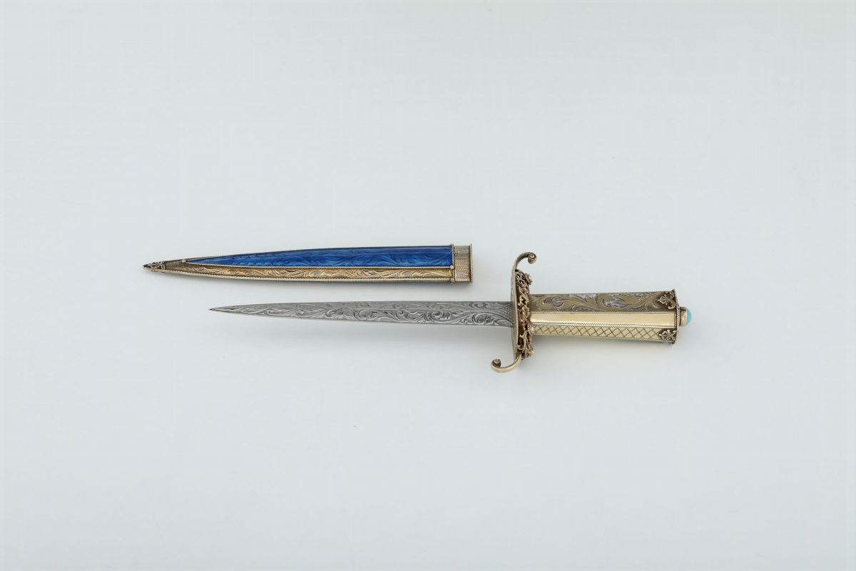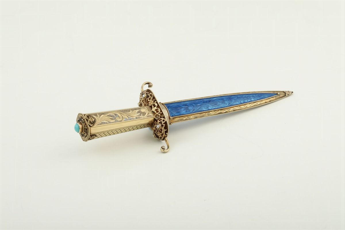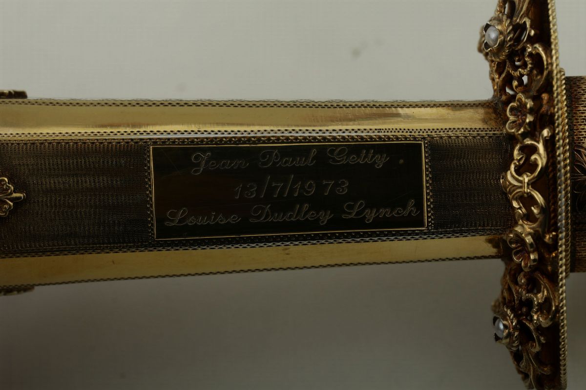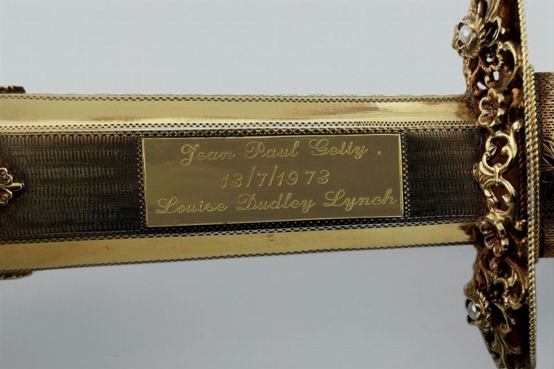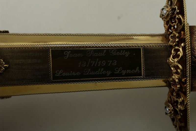 Molten, embossed and chiselled silver, with turquoises and pearls (?) on the handle). Gifted by tycoon Jean Paul Getty to his fifth wife Louise. 28cm
