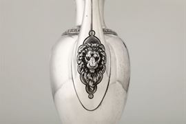 Molten, embossed and chiselled silver; ebonised wood. City's guarantee stamps and unidentified silversmith's mark.