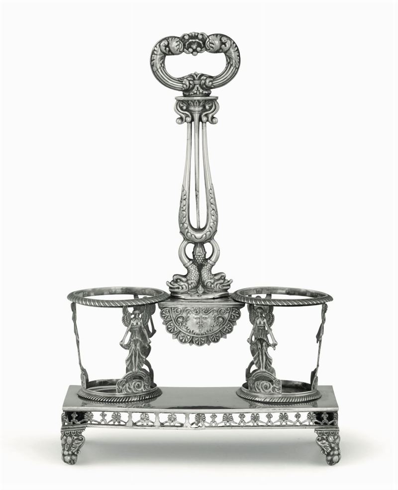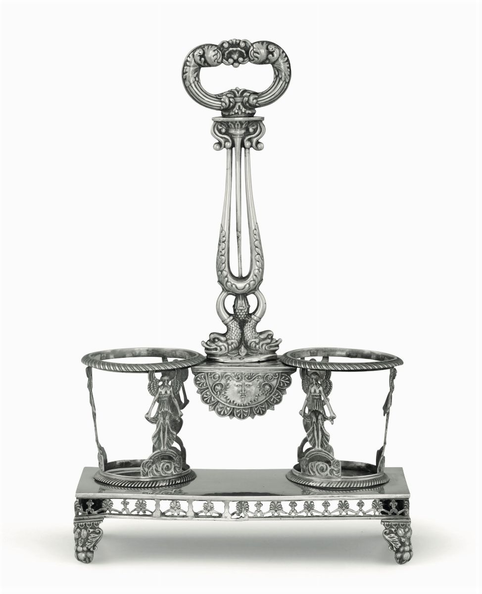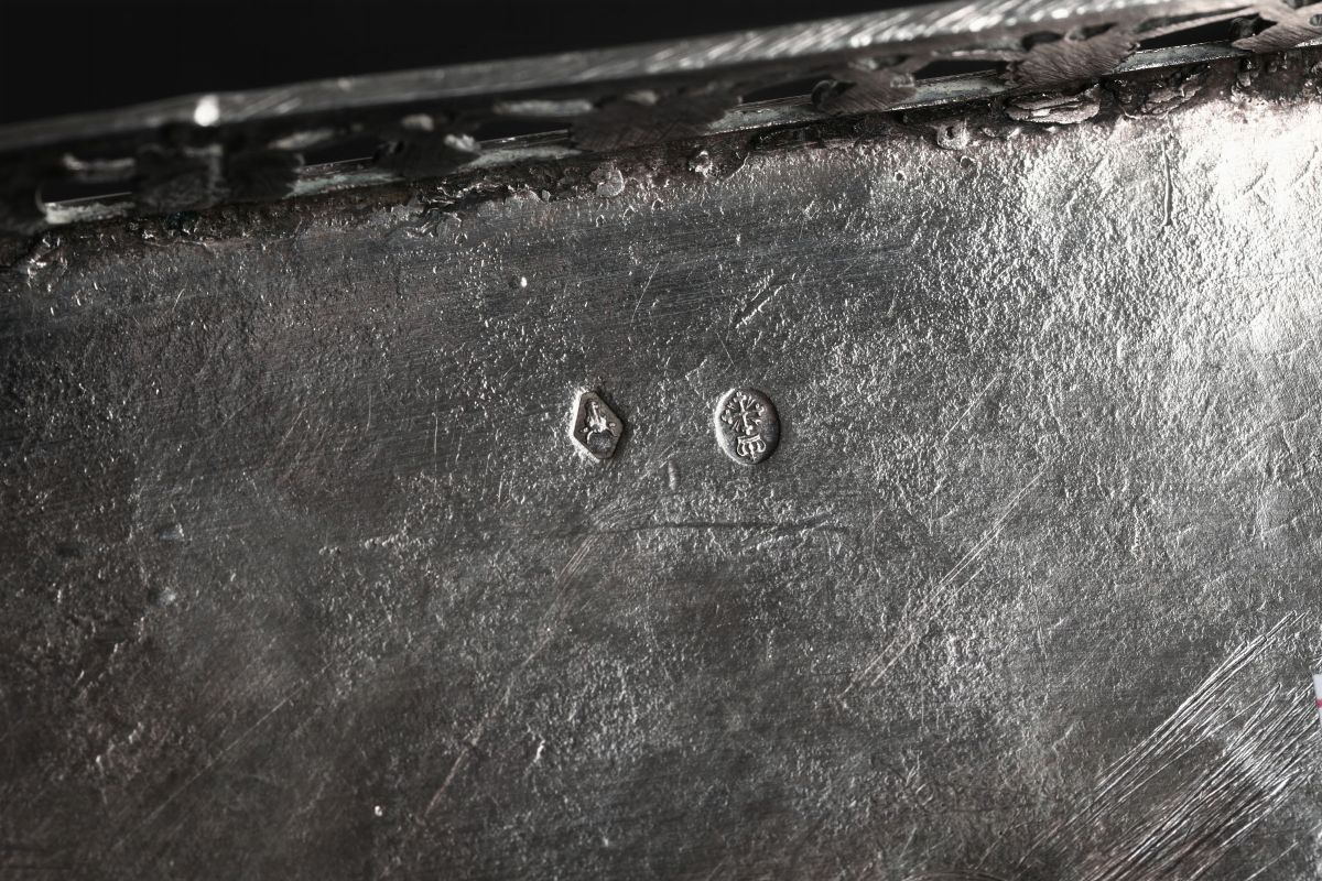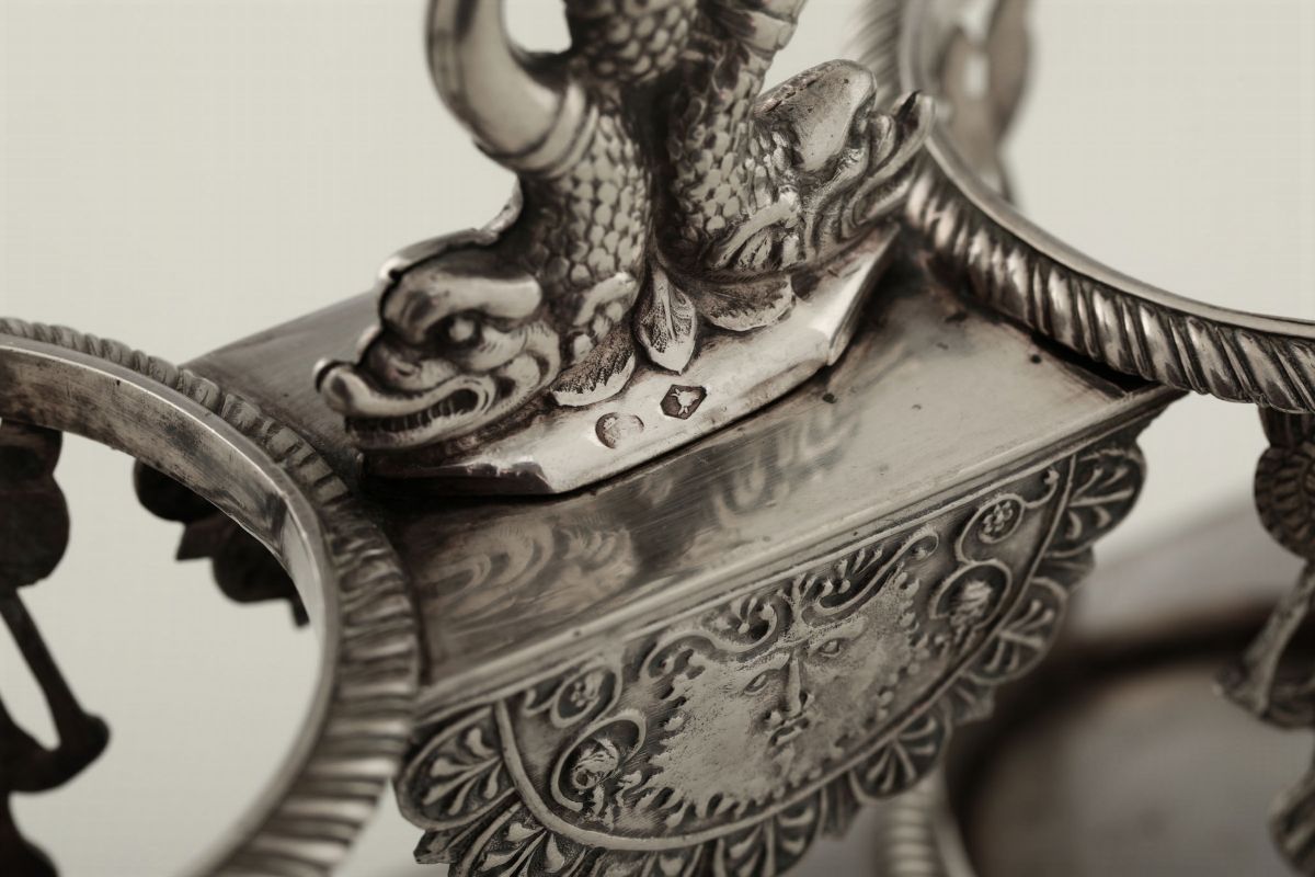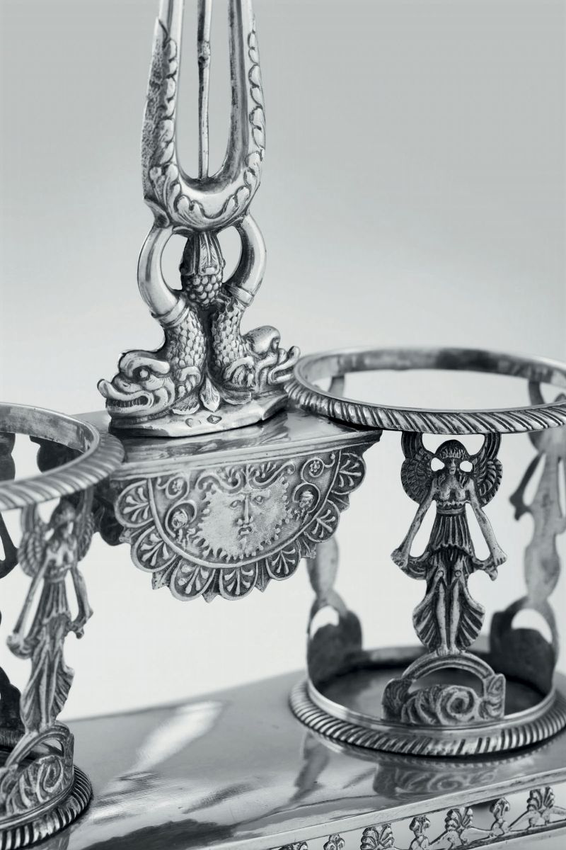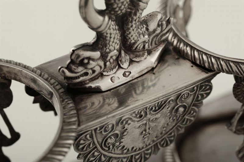 Molten, embossed and chiselled silver. City stamp and guarantee stamp in use from 1824 to 1873, mark for silversmith Giobatta Lasagno (1831-....). 560gr, 34x22.5x9.2cm