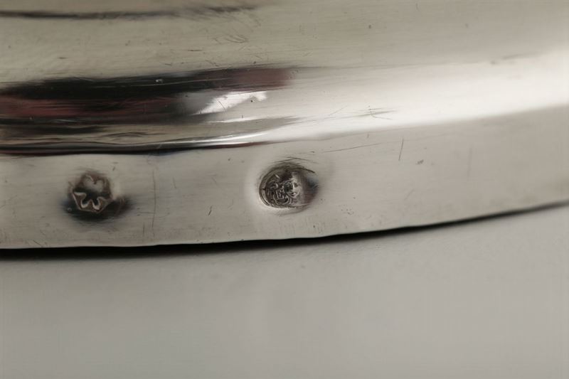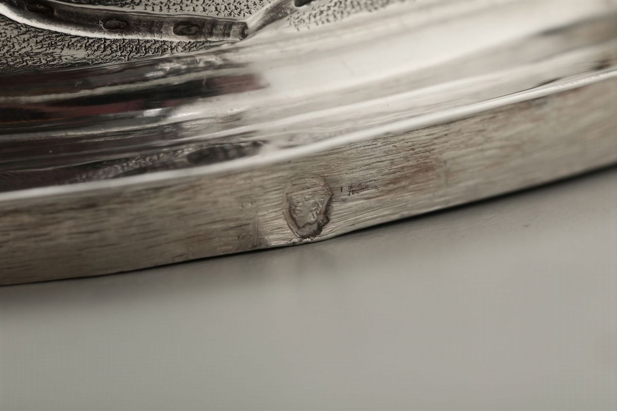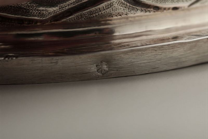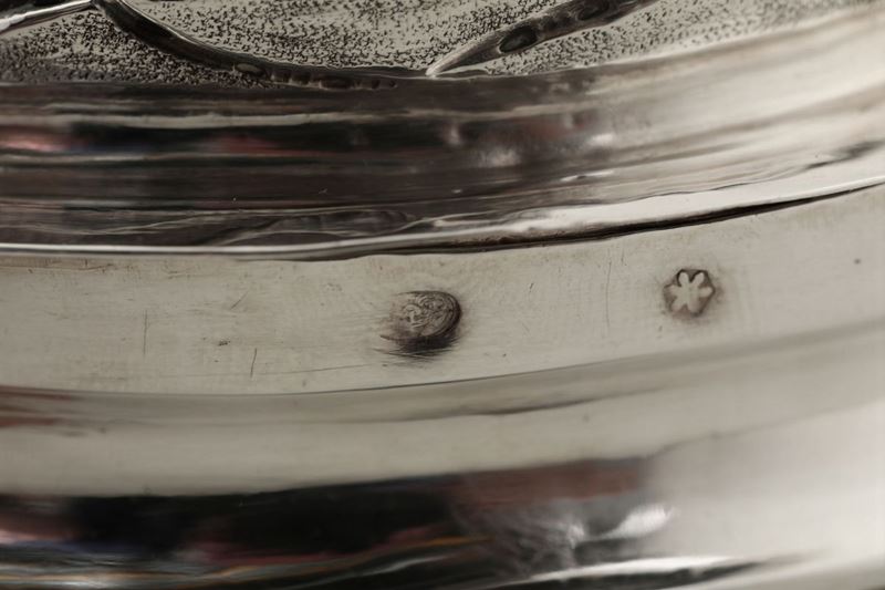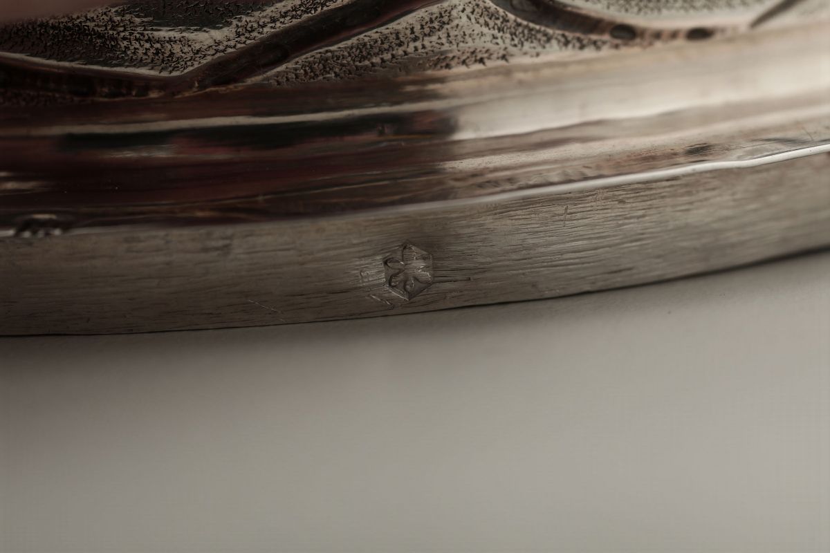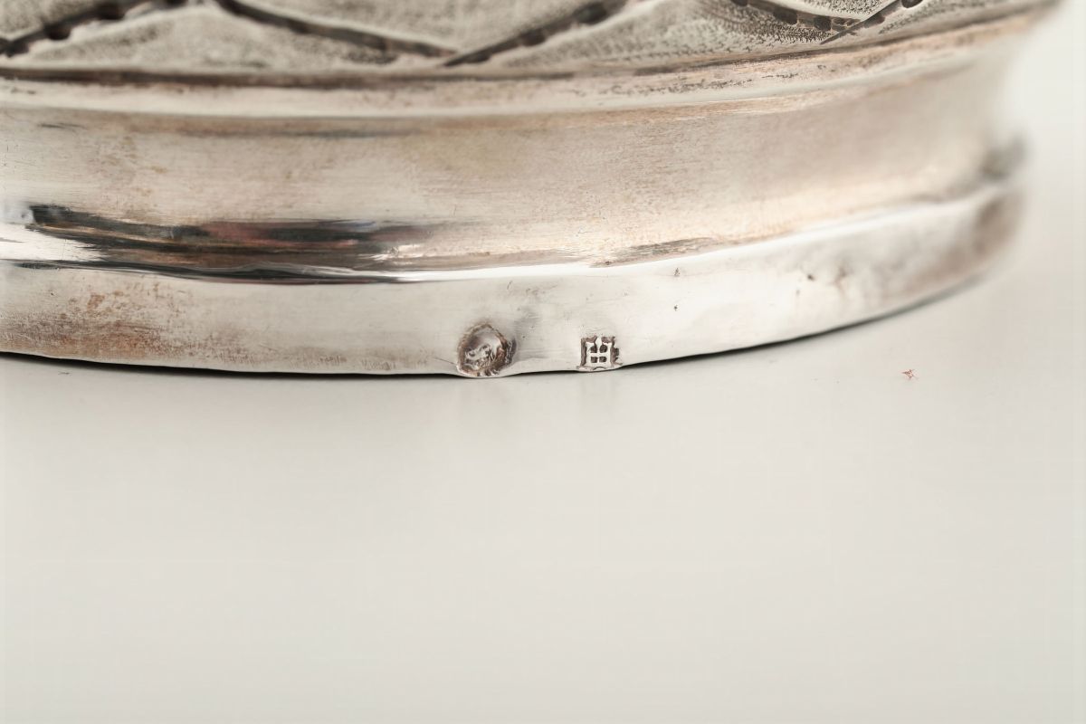 Molten, embossed and chiselled silver. Undated Torretta stamp and unidentified silversmith's mark. 13x14cm