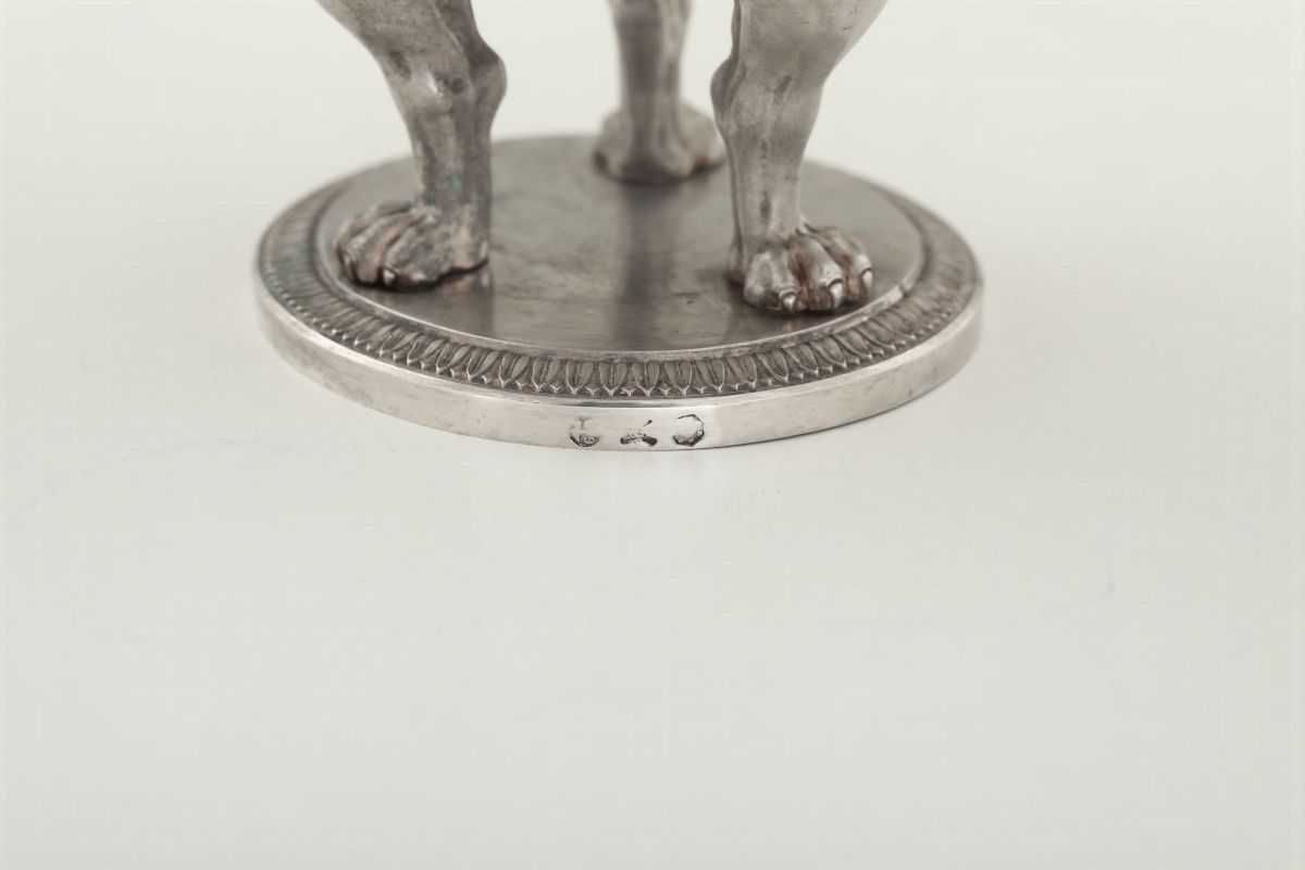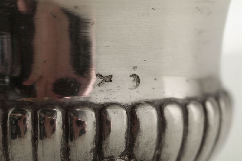 Molten, embossed, chiselled and engraved silver. Title stamps and mark for silversmith Giuseppe Brusa (...1820-1876...). 450gr, H 17.5cm