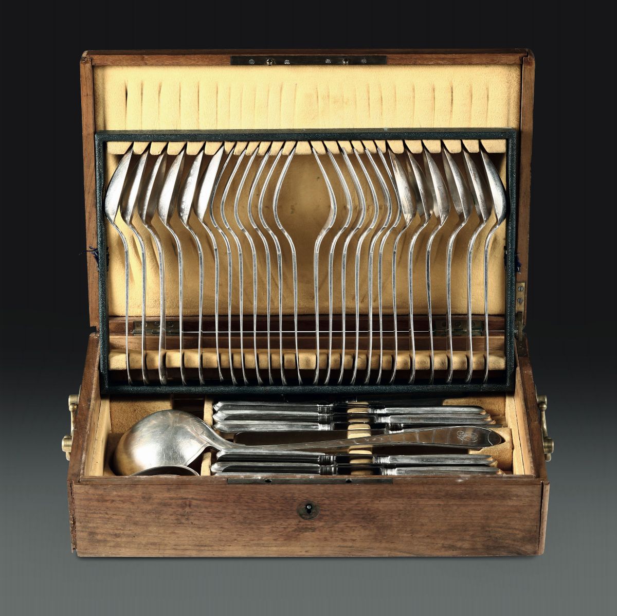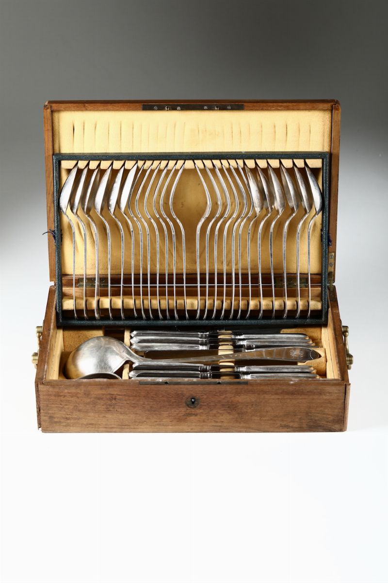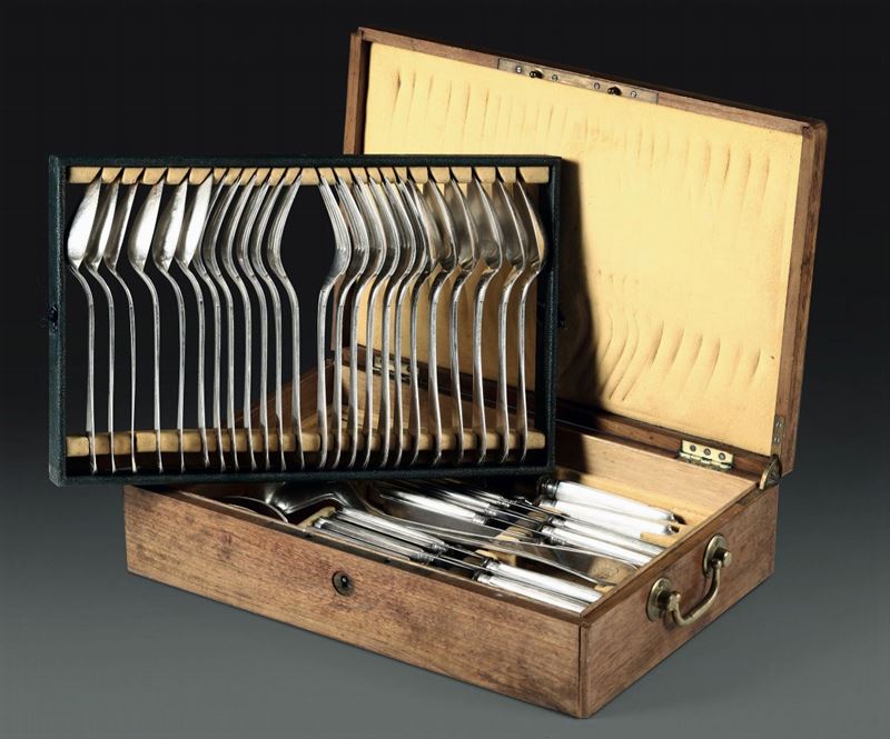 41-piece set for 12 people within a wooden case. City mint stamps in use from 1824 to 1872 and mark for silversmith Giovanni Canavero (doc. from 1816).