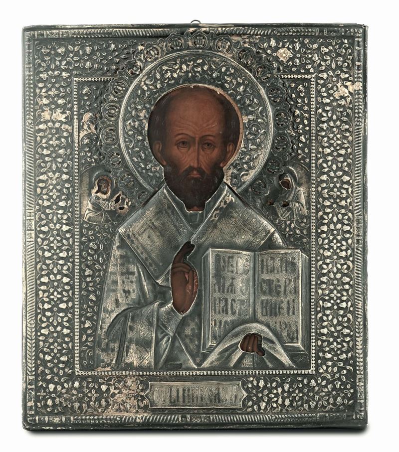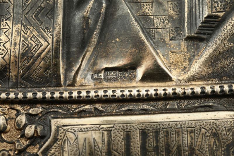 Embossed and chiselled silver riza. Assayer Victor Sarinkov. 31x27cm