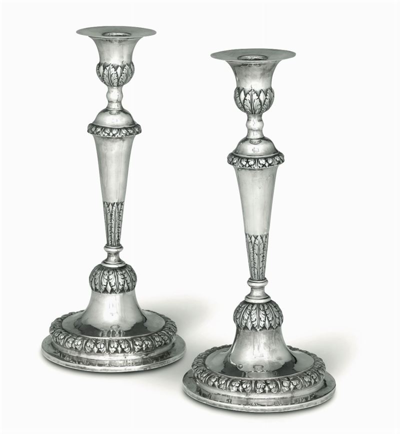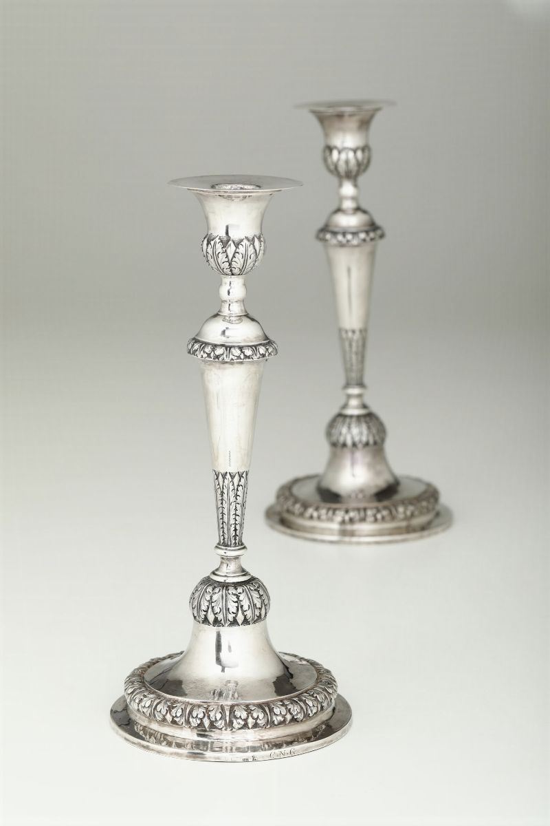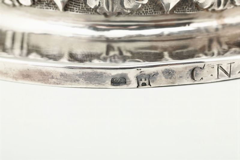 Molten, embossed, chiselled and engraved silver. Torretta stamp for the year (1)822. ca 490gr total, H 29.5, diametre of the base 13.5cm