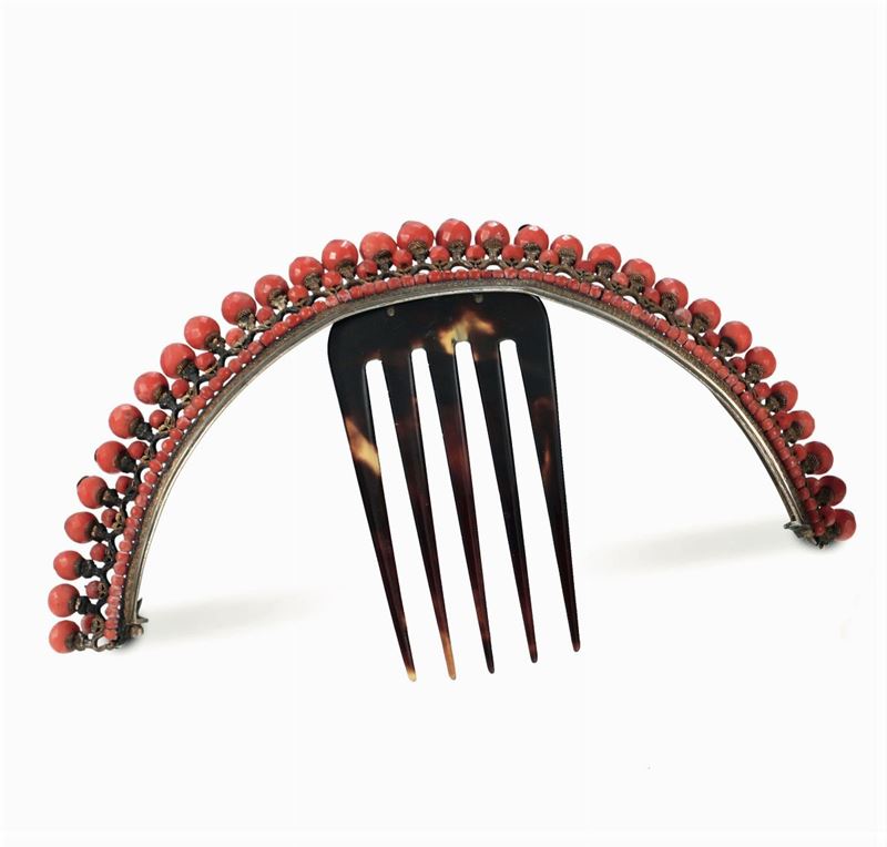A tortoise and gilt metal comb with coral spheres, and a gilt metal ornament with coral details. 14.8x8.5cm and 17x2.8cm