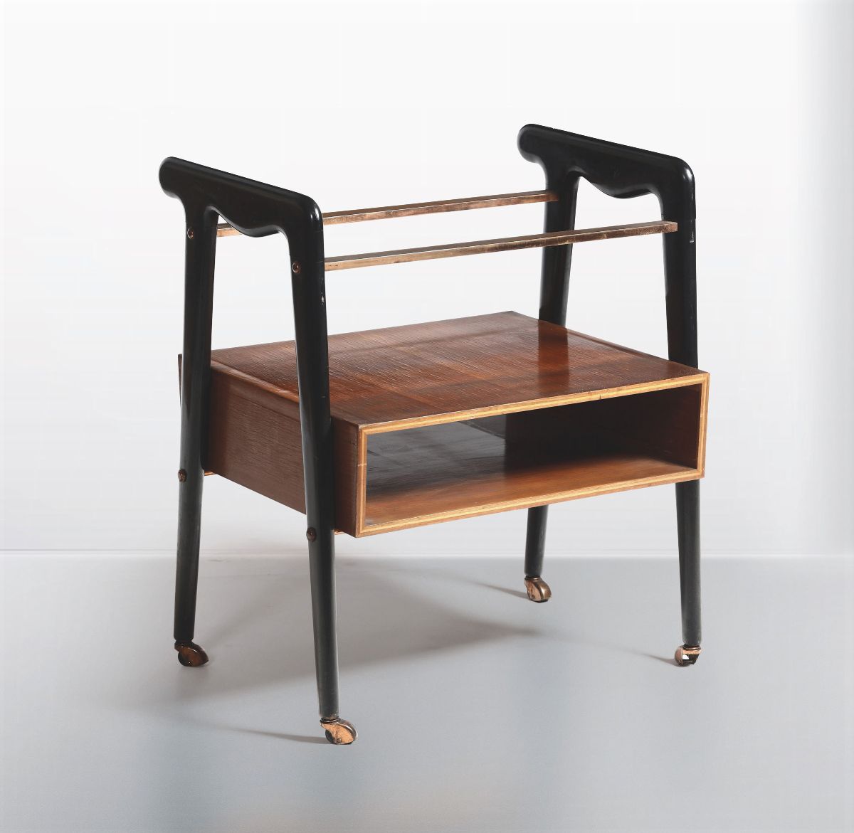 Carrello con struttura in legno e legno ebanizzato. Elementi in ottone.Vetro mancante.