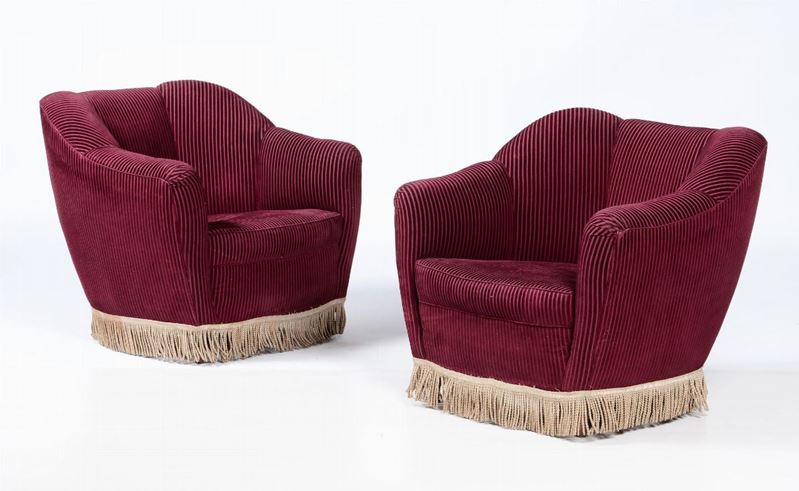 Salotto composto da un divano e due poltrone con struttura in legno e rivestimenti in velluto.