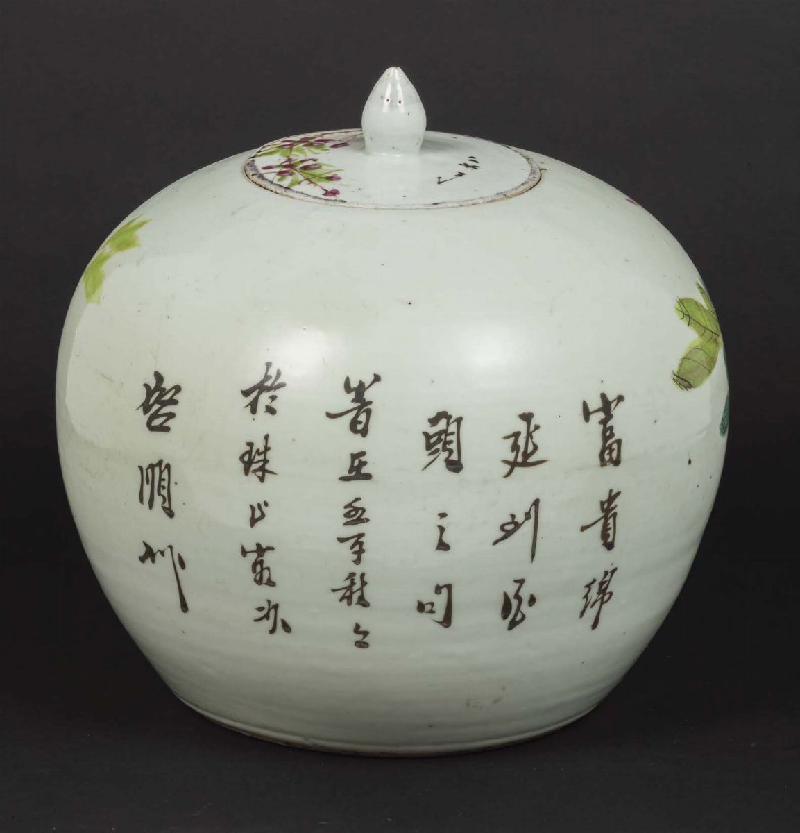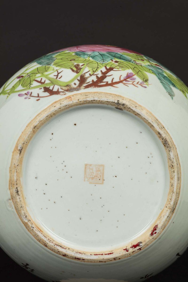 A Pink Family porcelain potiche with lid with a decor of a sparrow and blossoming peonies, China, 20th century