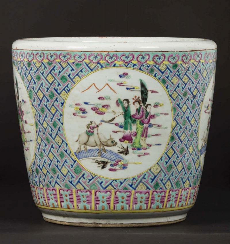 A polychrome glazed porcelain cachepot with Guanyin within reserves, China, Qing Dynasty, 19th century