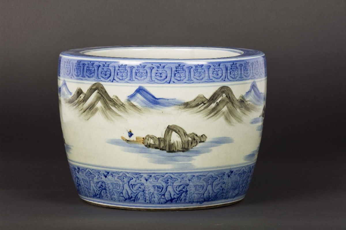 A polychrome-enamelled porcelain cachepot with landscape, China, Qing Dynasty, 19th century