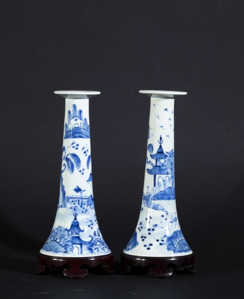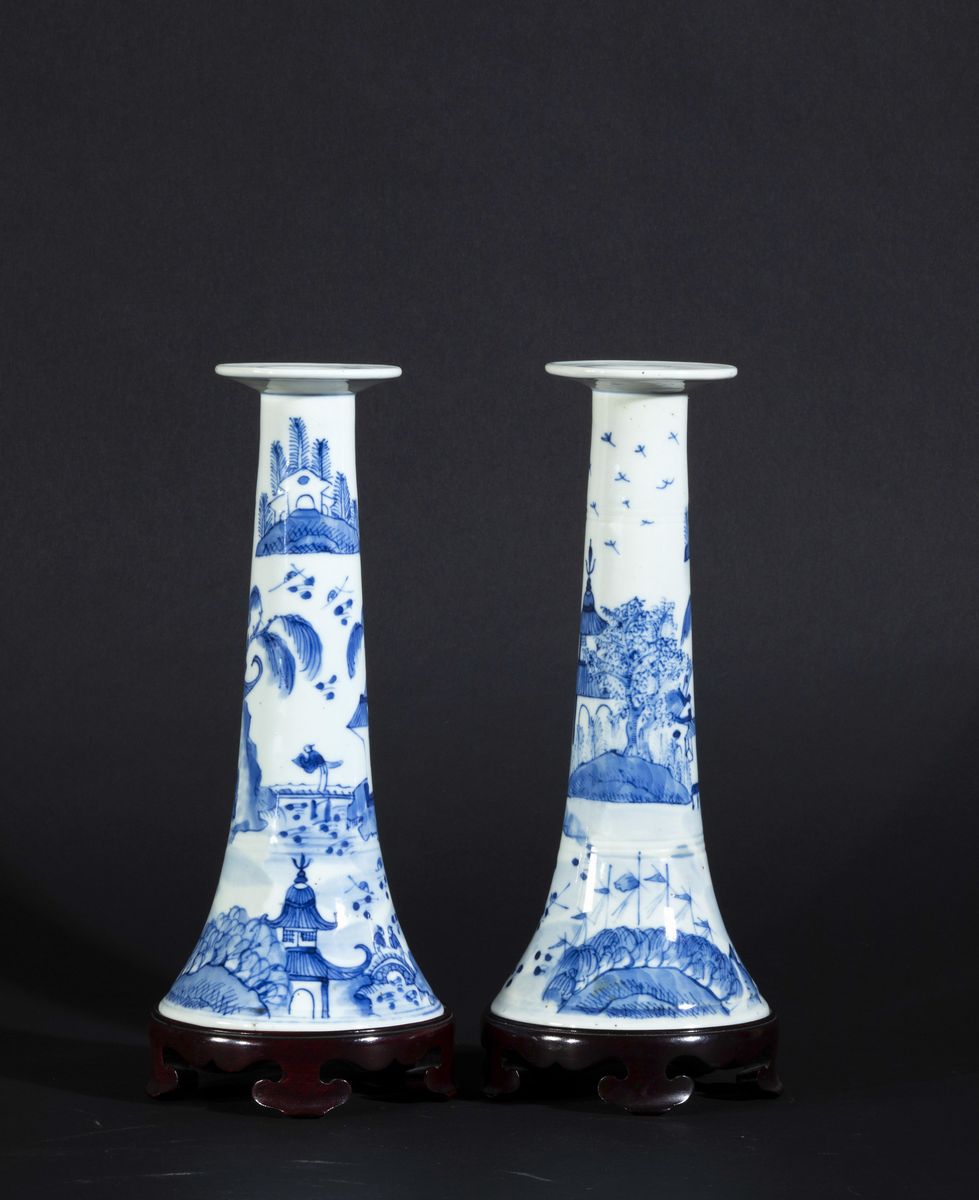 Coppia di candelieri in porcellana bianca e blu con raffigurazioni di paesaggio con personaggi e pagode, Cina, XX secolo