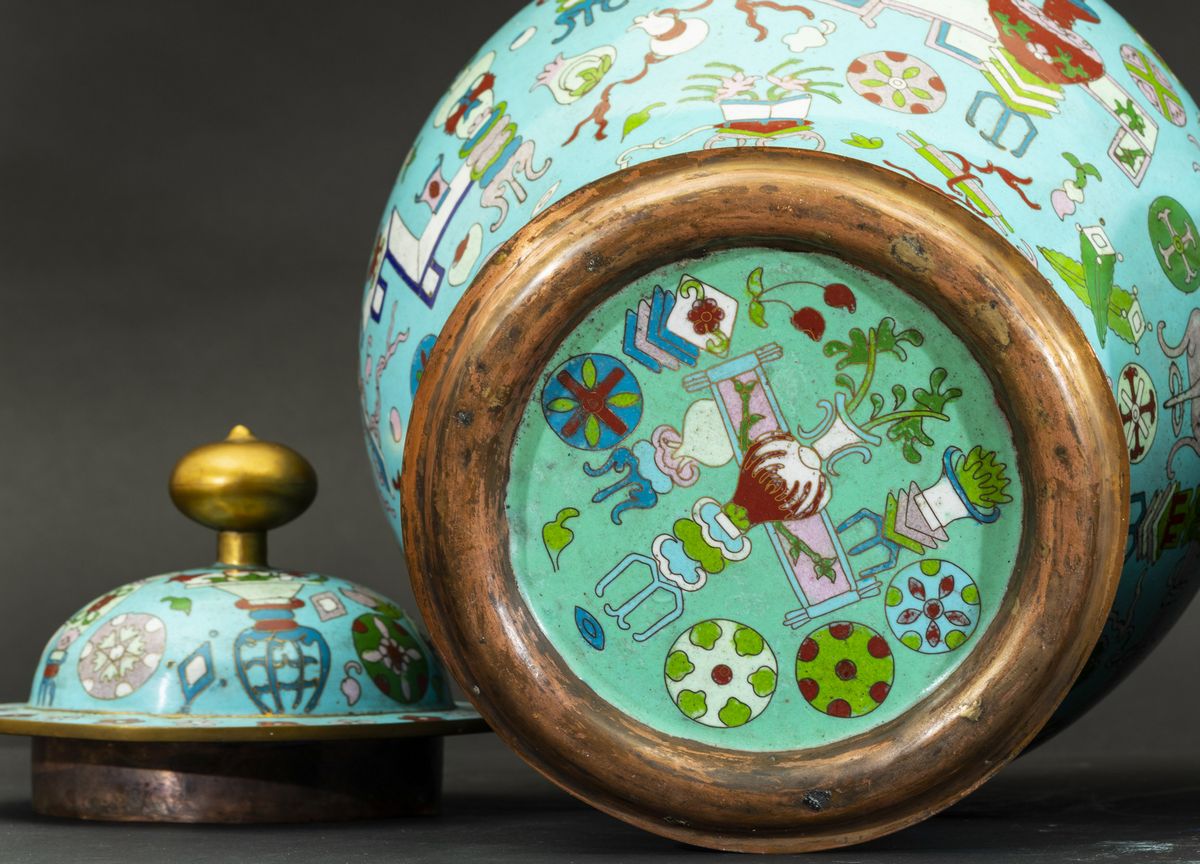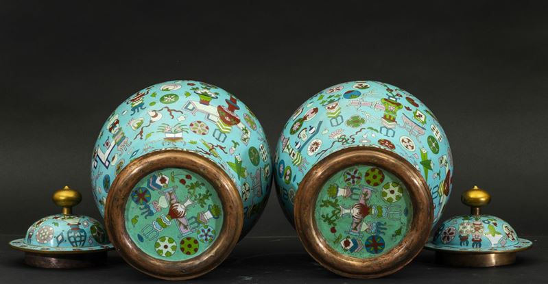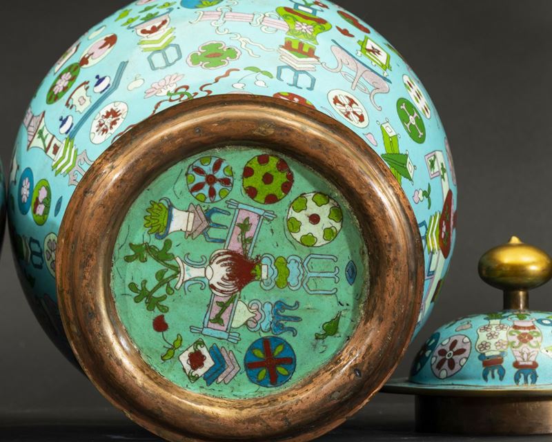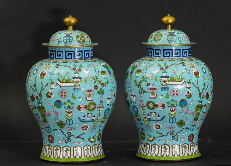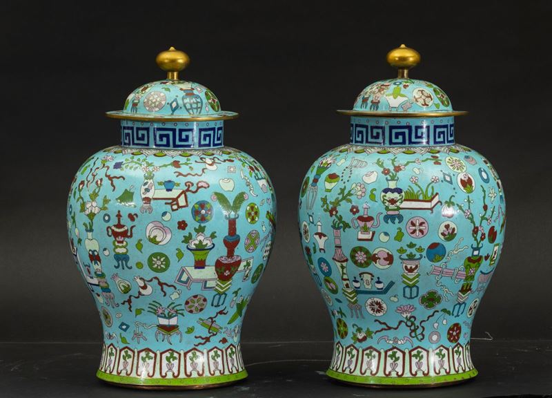 Coppia di potiches a smalti cloisonnè con decori naturalistici su fondo azzurro, Cina, XX secolo
