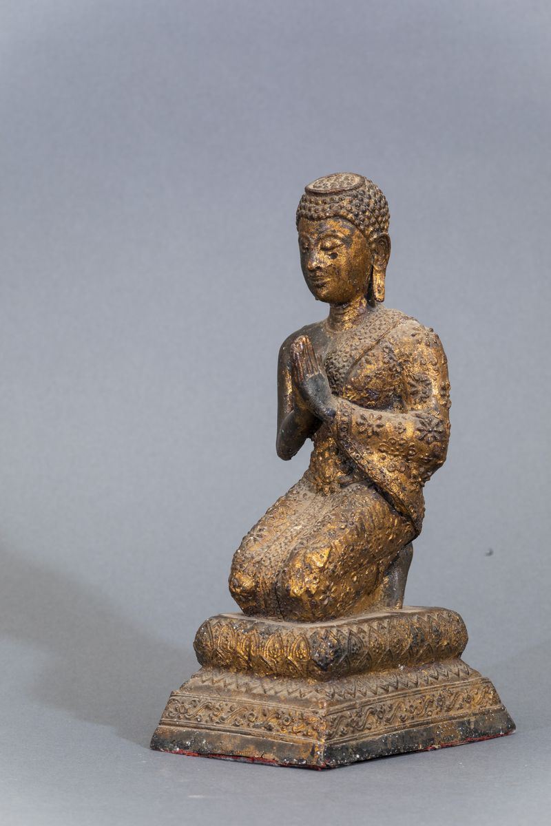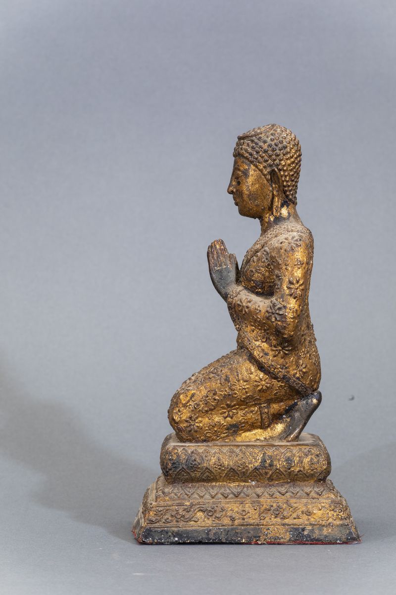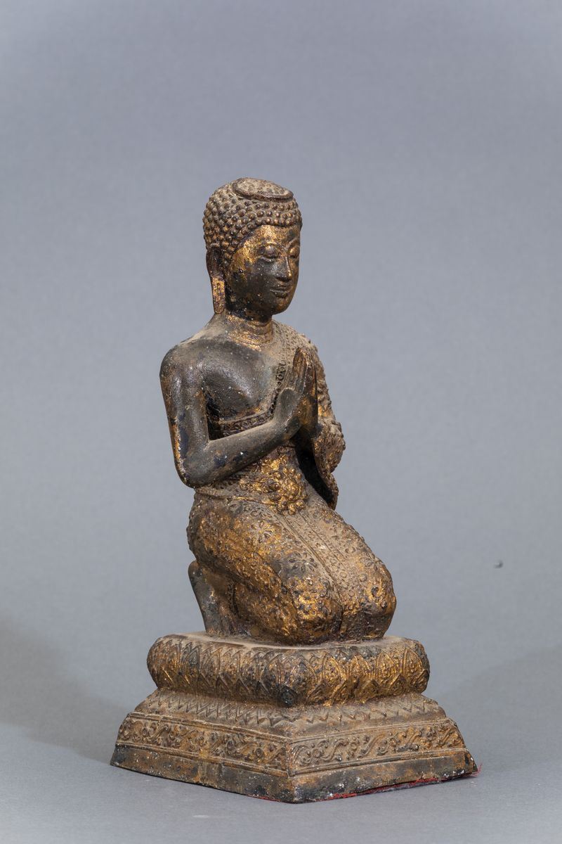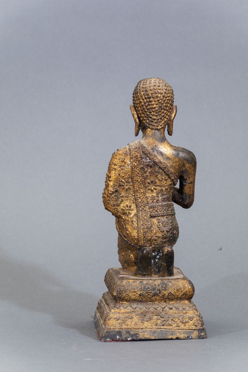 Figura di monaco in preghiera in bronzo con tracce di doratura, Thailandia, XX secolo