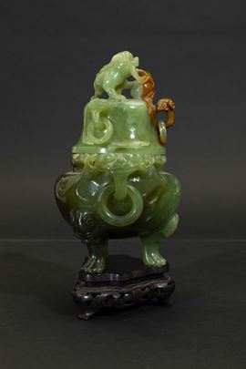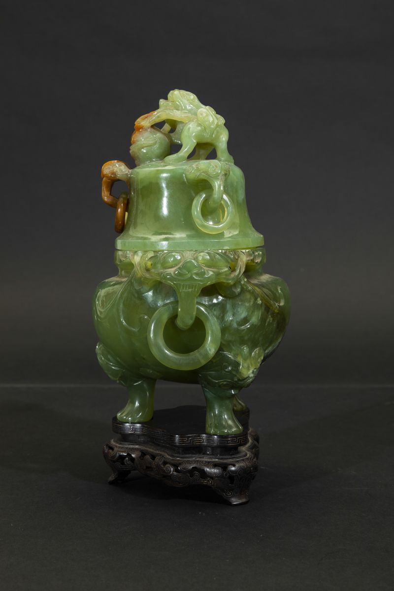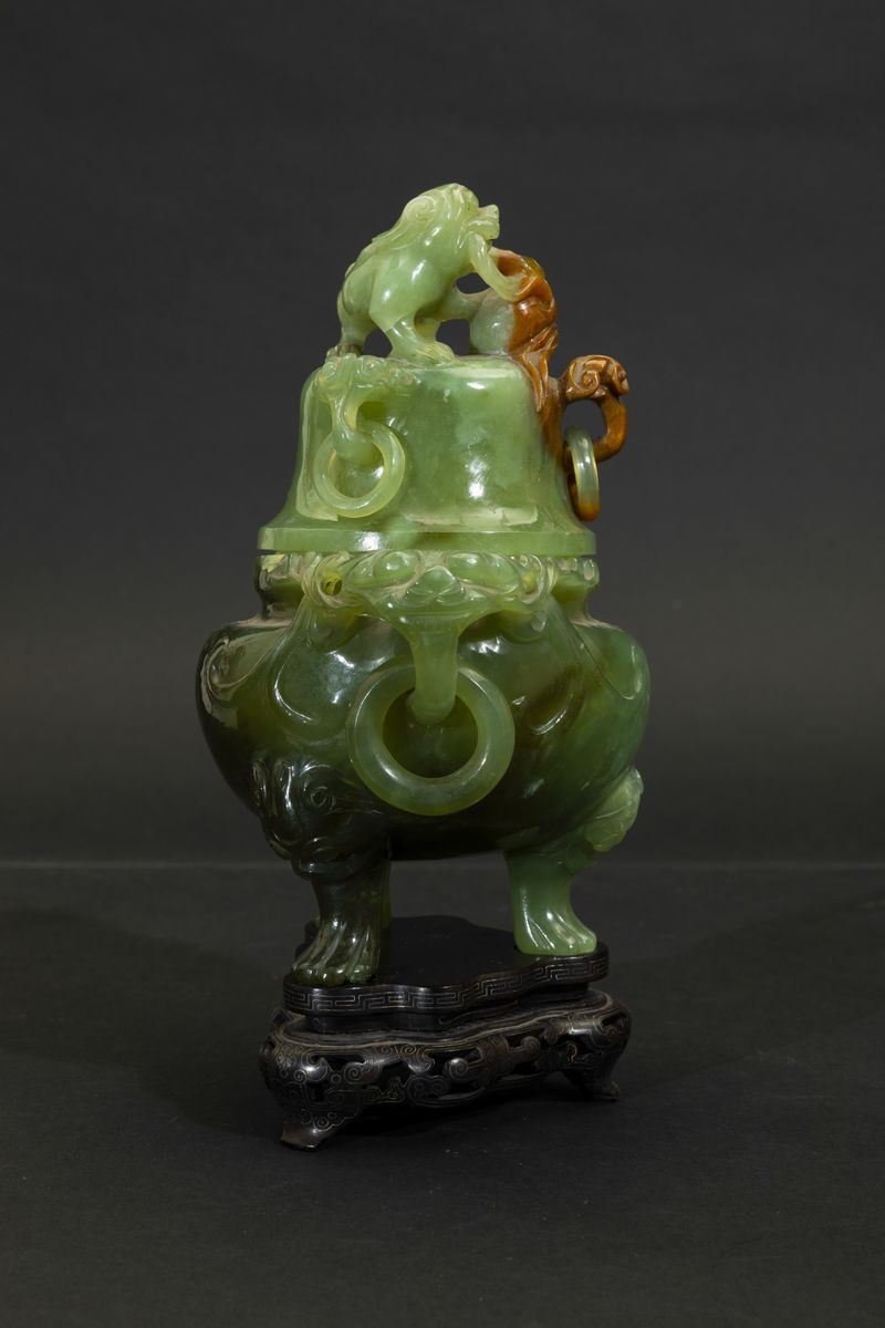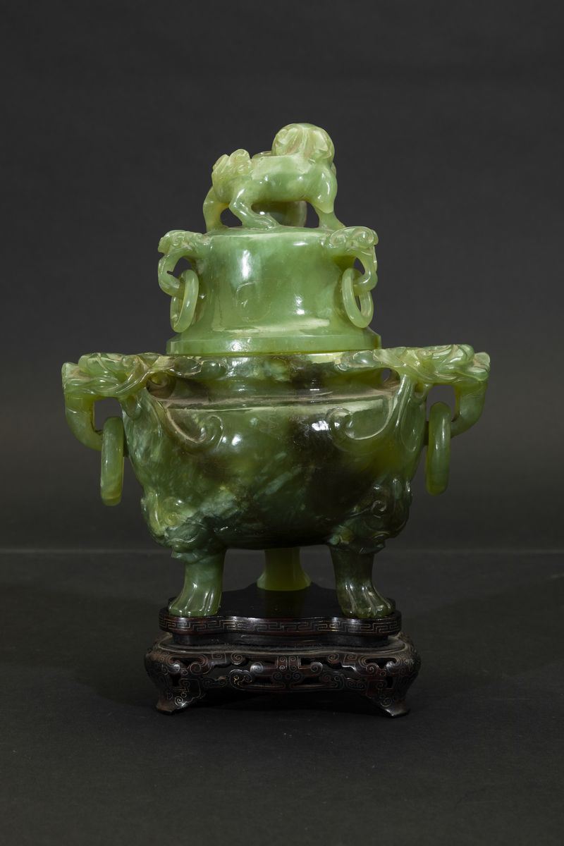 Incensiere scolpito tripode con coperchio in giadeite con anse ad anello, mascheroni e presa a foggia di cane di Pho, Cina, [..]