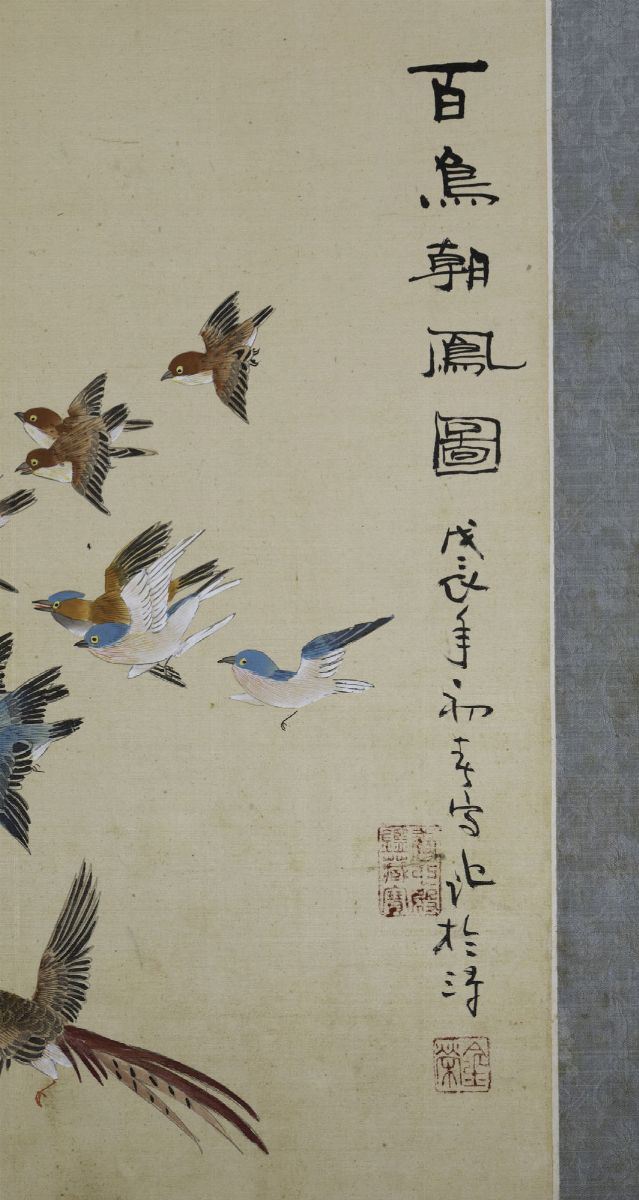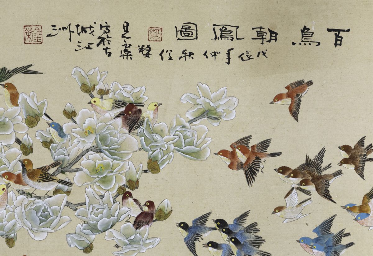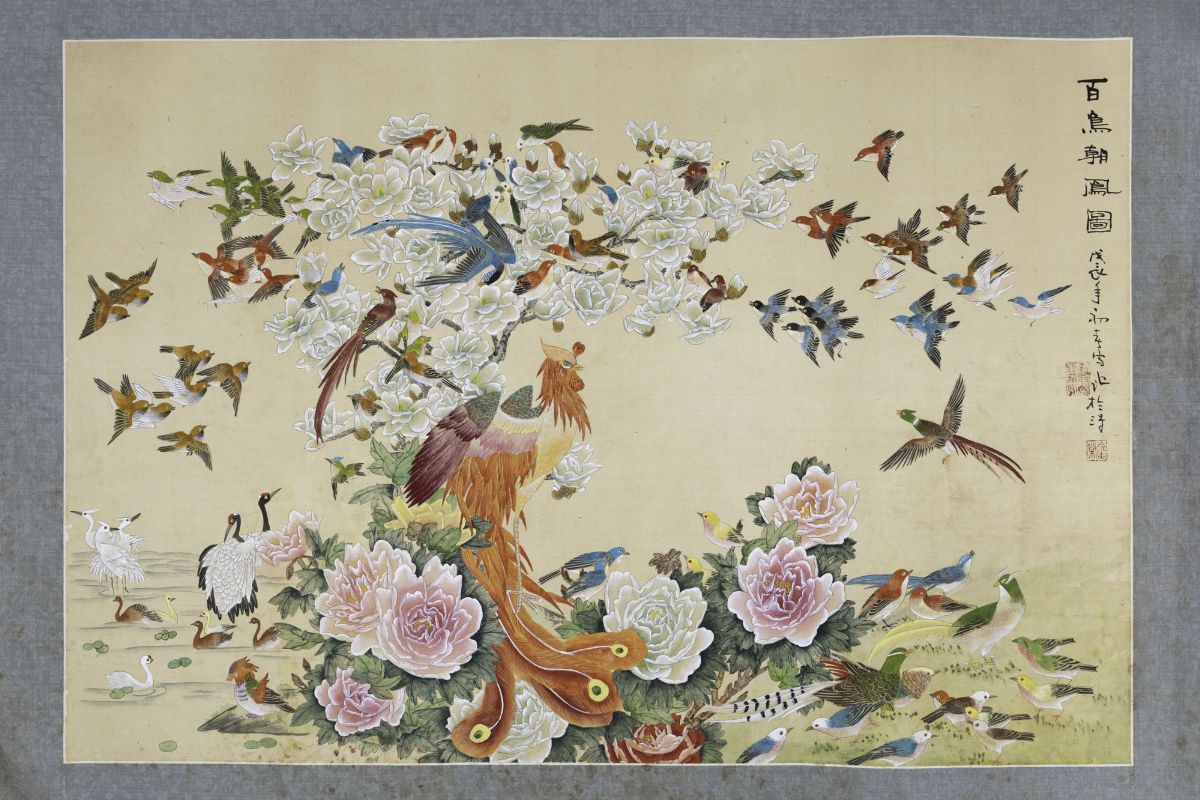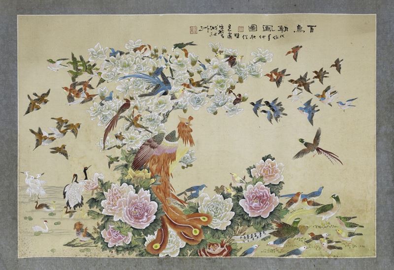 Phoenix, flowers and inscriptions. 78.5x116cm