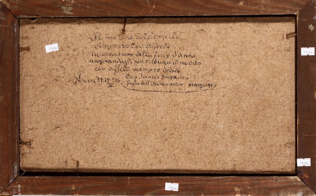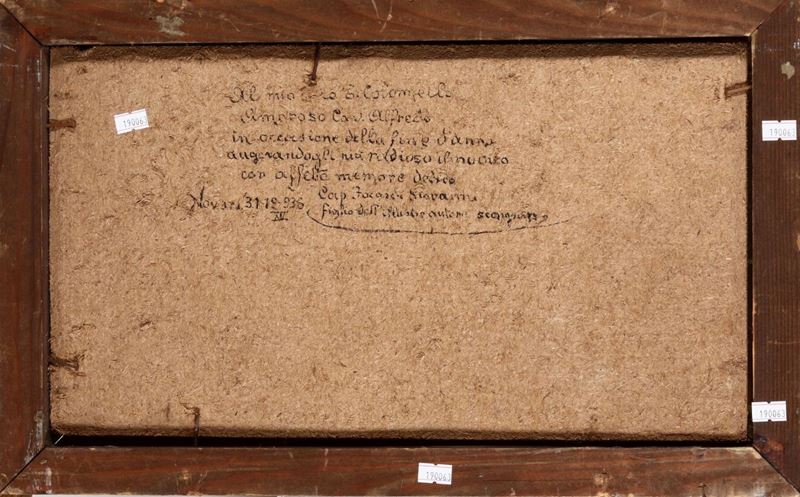 olio su masonite, cm 45x25, firmato in basso a destra, dedica al retro