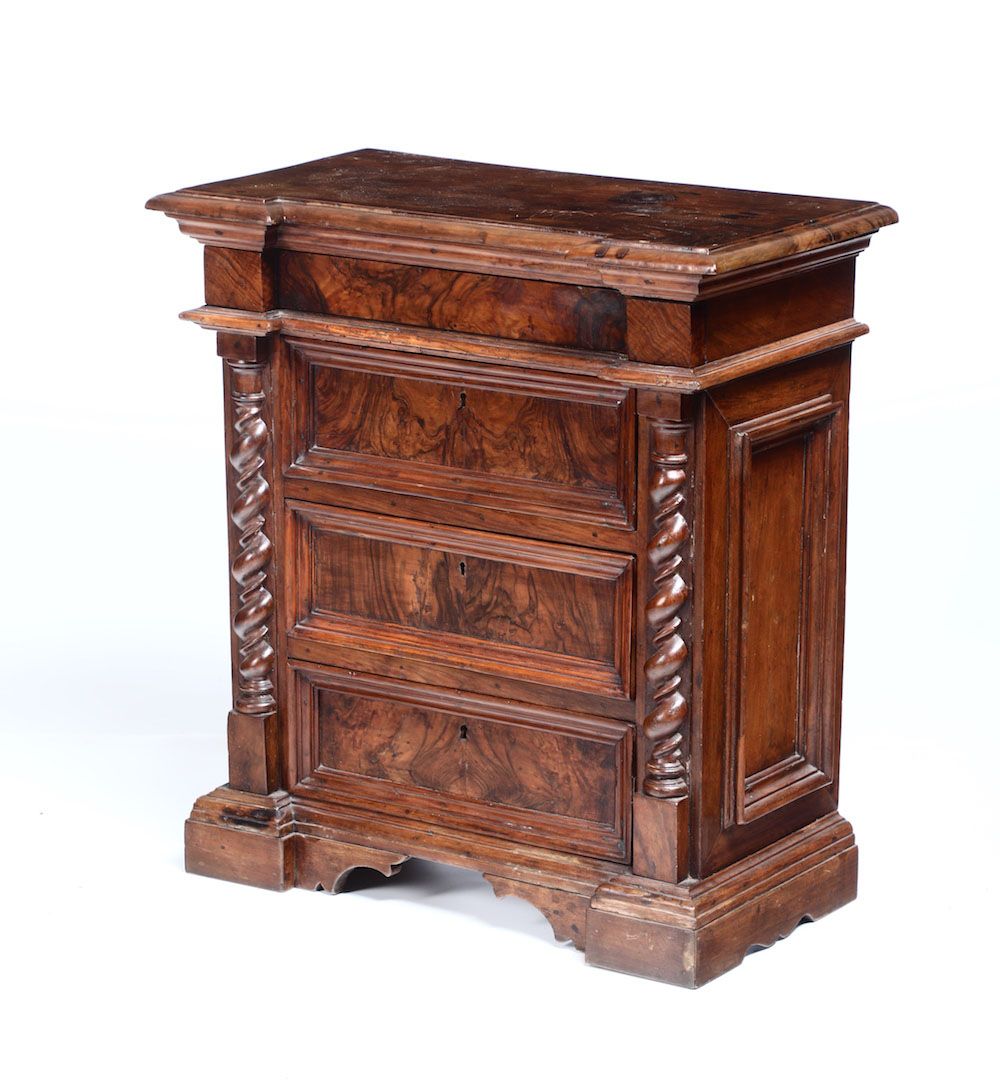 Comodino in stile a tre cassetti con montanti a torciglione, XIX-XX secolo