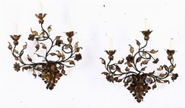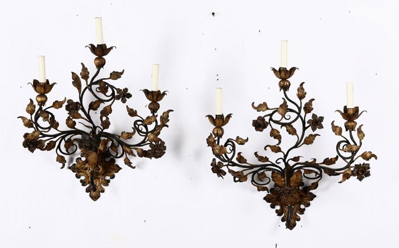 Gruppo di quattro appliques in metallo dorato a tre luci, XIX secolo