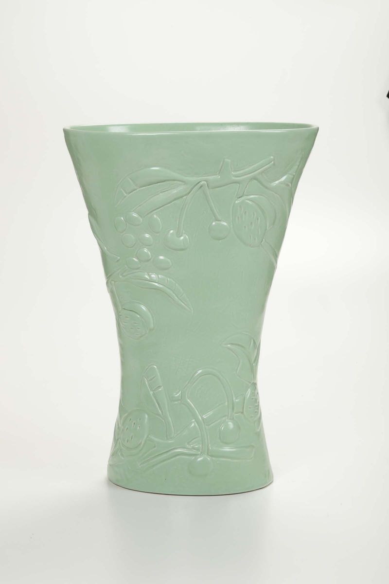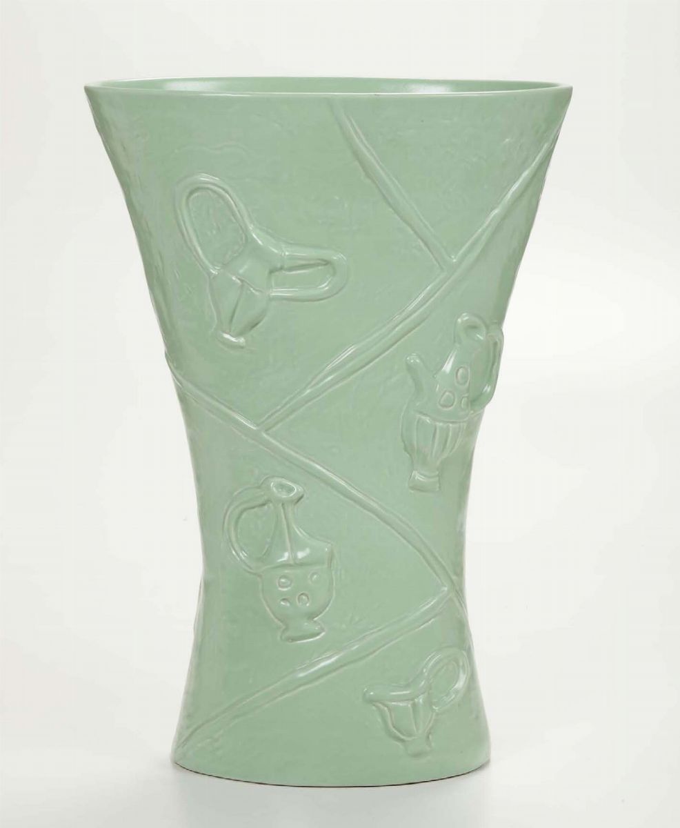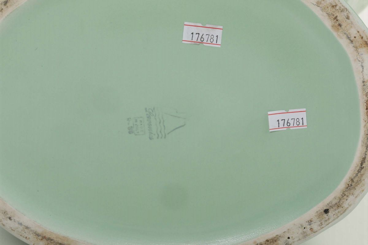 Vaso ovale portaombrelli in terraglia a colaggio con decoro a rilievi.