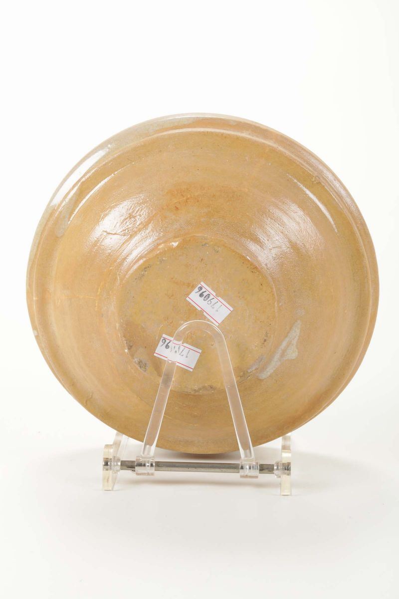 Maiolica policroma. Altezza cm 8,5; diametro cm 18,5. Rotta in più frammenti e ricomposta in restauro; qualche integrazione