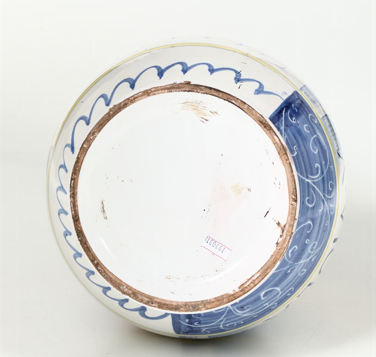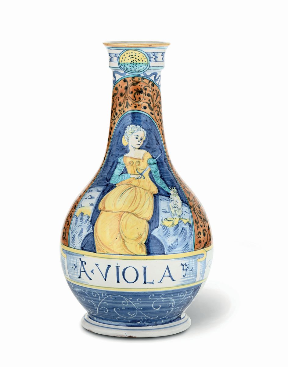 Questa fiasca è la copia di una celeberrima eseguita a Castelli d’Abruzzo attorno alla metà del XVI secolo e pubblicata ad esempio in AA.VV., Le Maioliche Cinquecentesche di Castelli, Una Grande Stagione Artistica Ritrovata, Brescia 1989, n. 436. Sul recto troviamo Giuditta che regge in mano la testa di Oloferne e il cartiglio con la scritta medicinale “A.VIOLA”