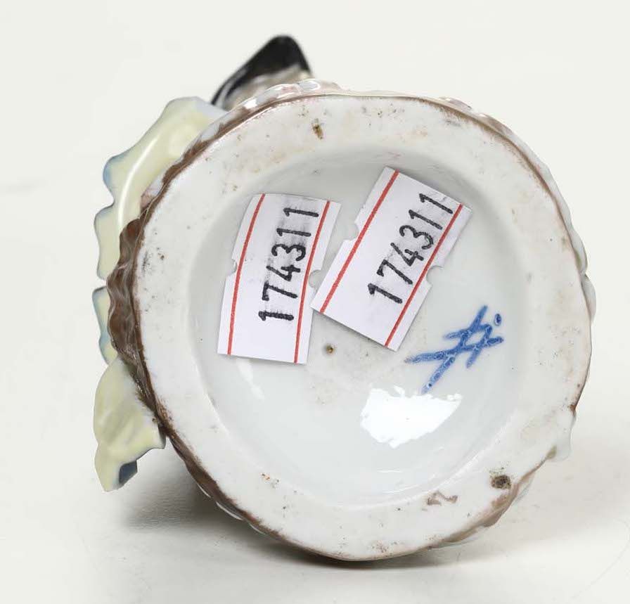 Porcellana. Marca: apocrifa di Meissen, spade incrociate con punto in blu. Altezza cm 12,4. Diverse rotture: giacca, una mano e un dito