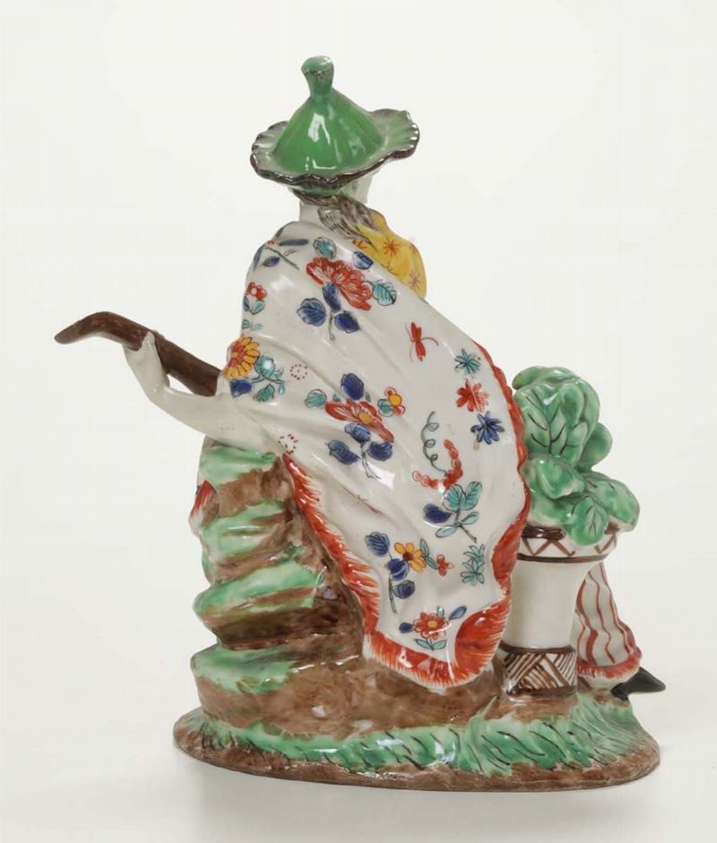 Porcellana policroma. Marca: apocrifa di Chantilly, corno rosso; marca di Samson; in rosso. Altezza cm 17. Restauri ad un piede, al braccio sinistro, al cappello e al manico dello strumento musicale