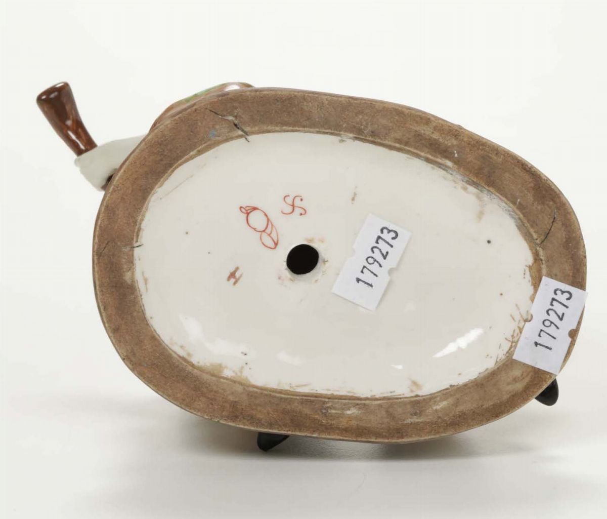 Questa porcellana, che raffigura un cinese nell’atto di suonare uno strumento a corde, è ispirata alle porcellane settecentesche della manifattura francese di Chantilly di cui ne imita anche la marca