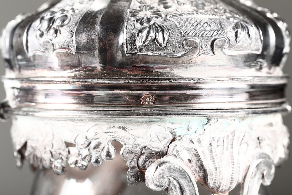 Dai manici e presa del coperchio modellati a motivi vegetali ha la decorazione policroma a riserve con paesaggi e trofei in oro